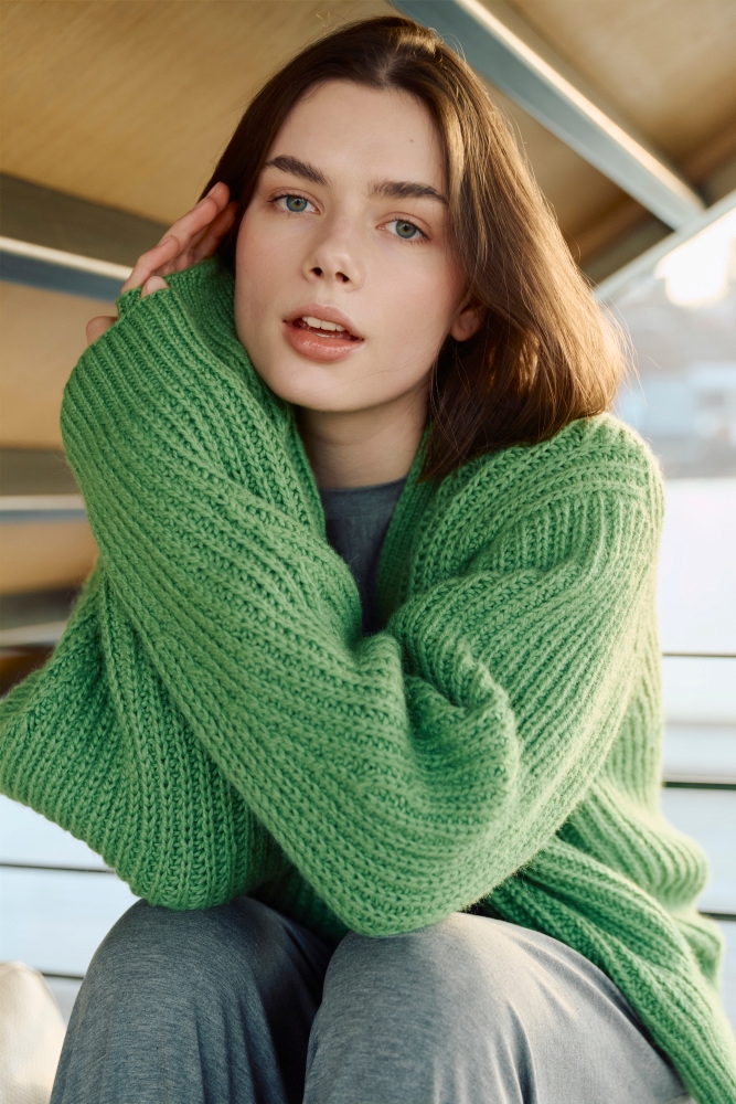 Genser til dame, strikket ovenfra og ned i dobbel tråd Børstet Alpakka. Strikkepakken er med garn og oppskrift.