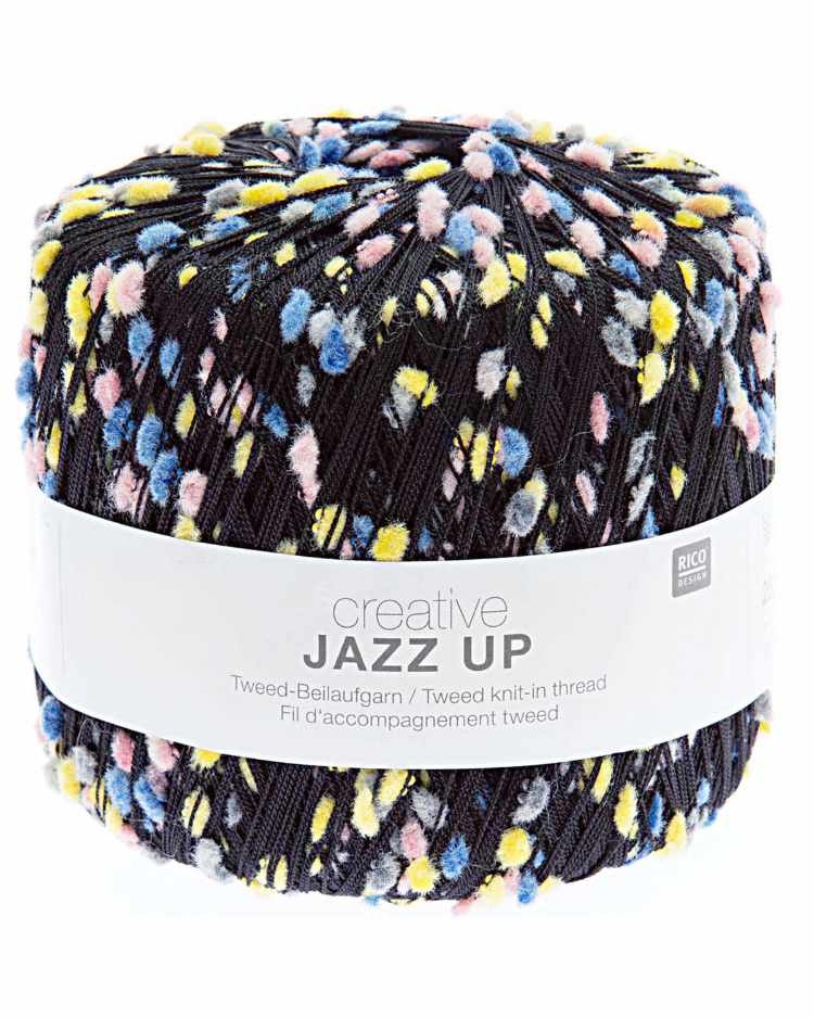 Creative Jazz Up er et felerfarget effektgarn med små pompons på. Garnet er superkult å strikke sammen med andre tråder for å få det lille ekstra.