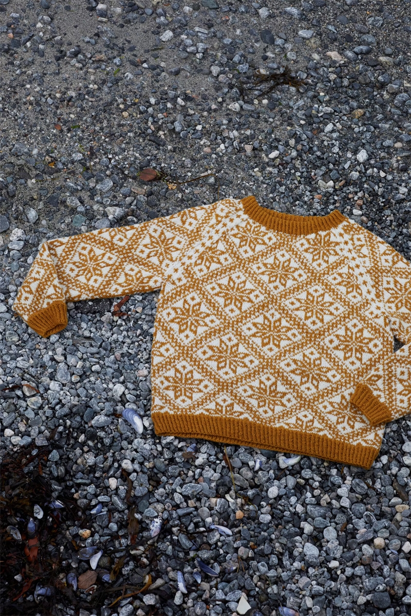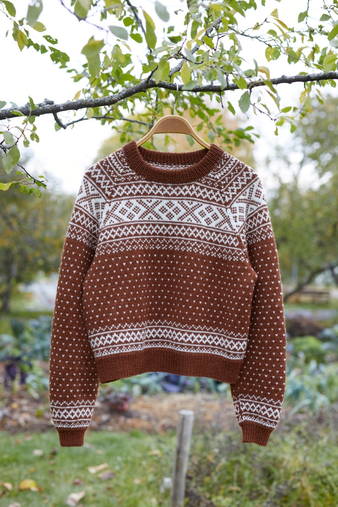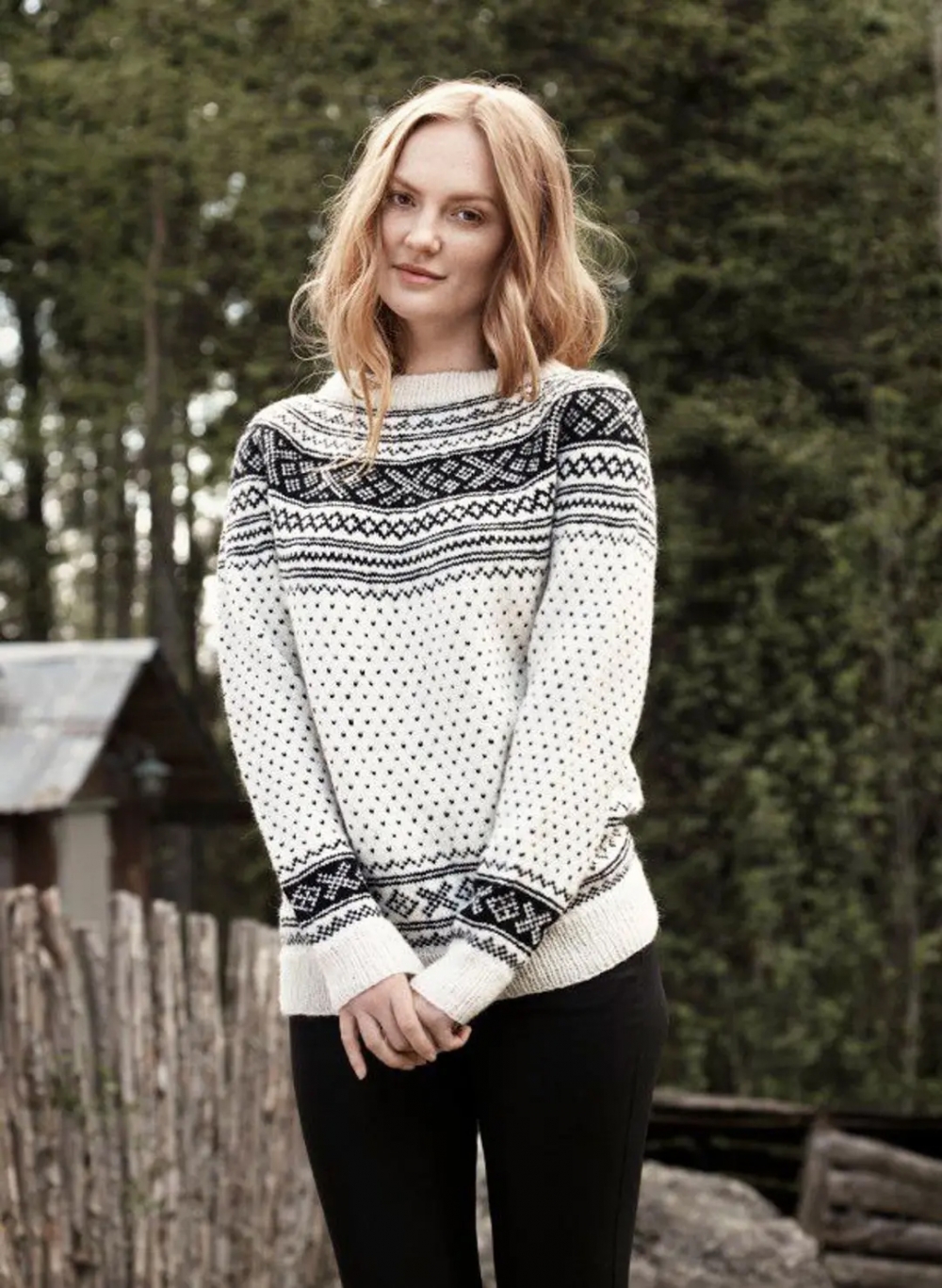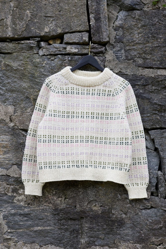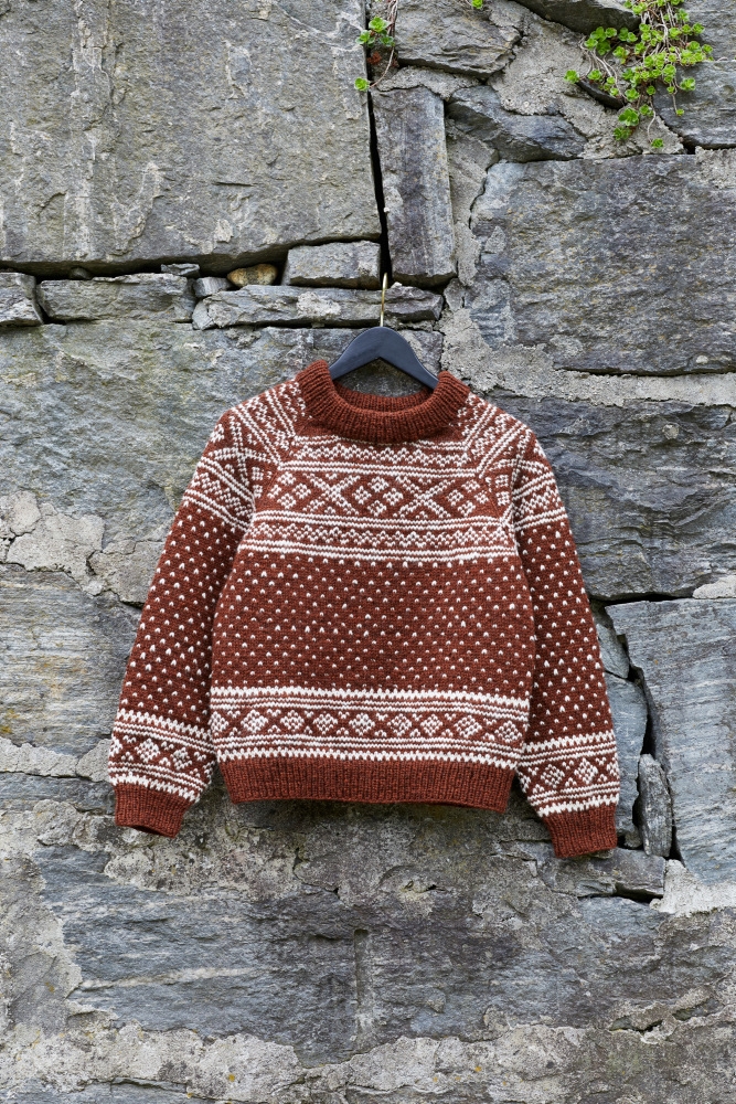 Det tradisjonsrike Setesdalsmønsteret er en klassiker som følger oss år etter år. Denne versjonen har raglanfelling og strikkes nedenfra og opp.