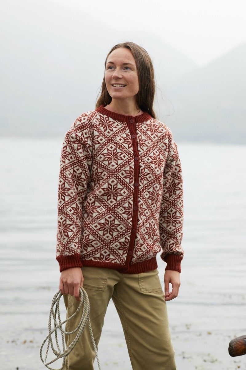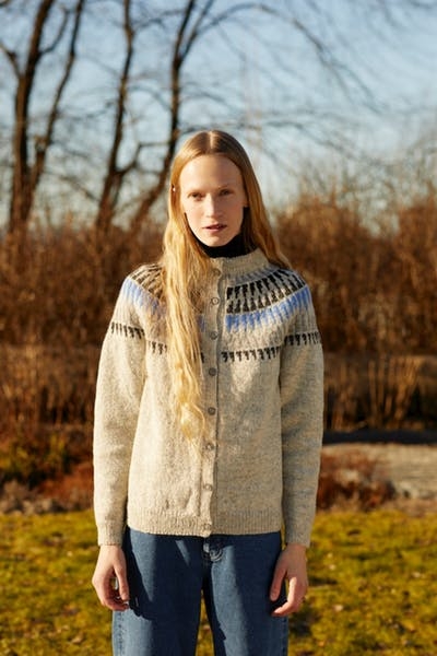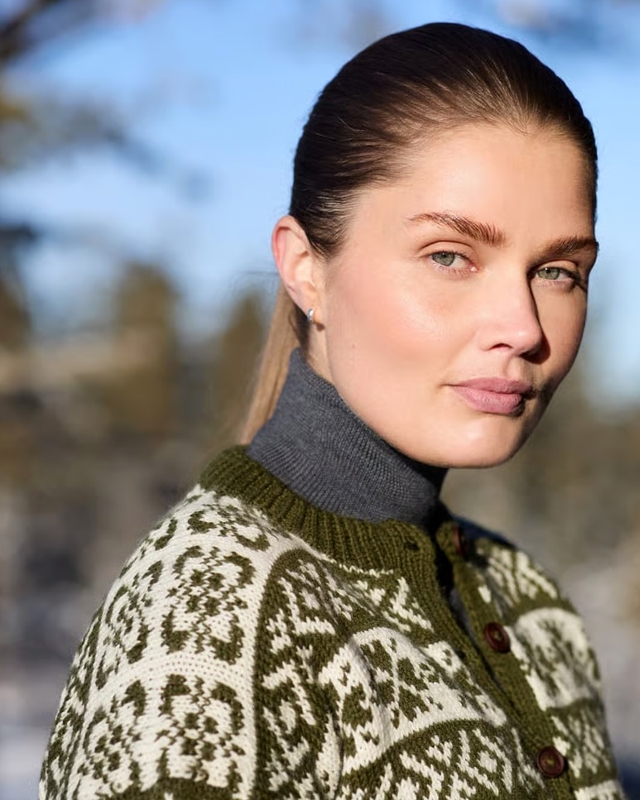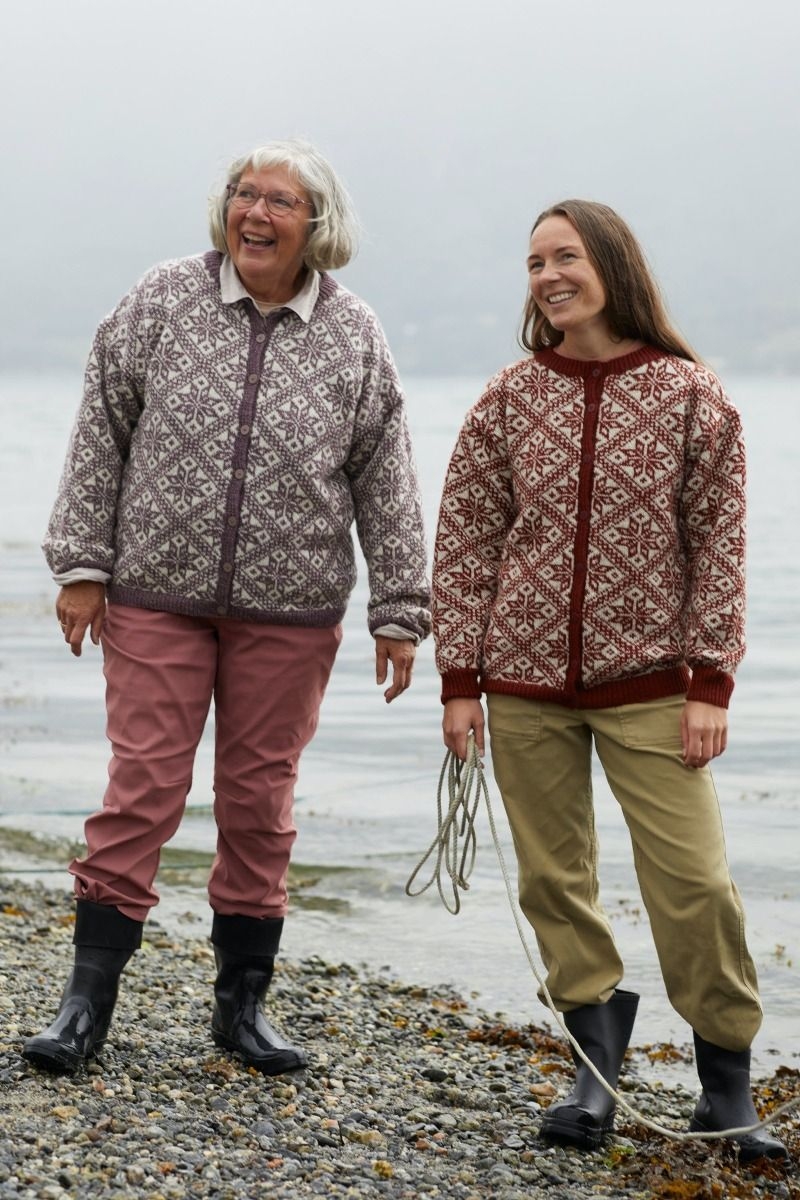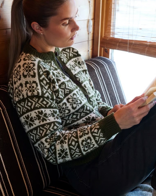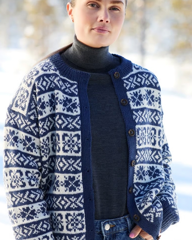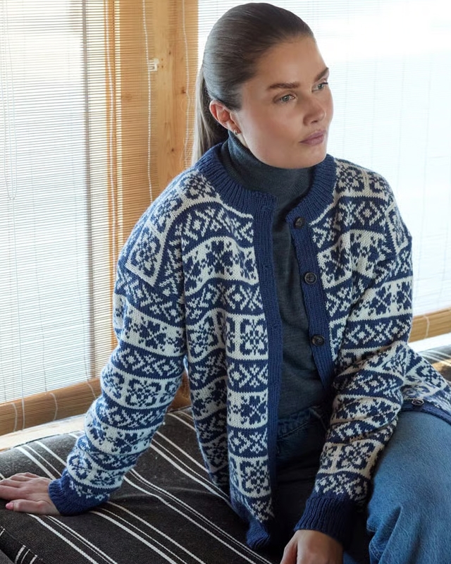 Vestfoldkofte til dame strikkes i Rauma Finullgarn - i denne pakken får du garn og oppskrift.