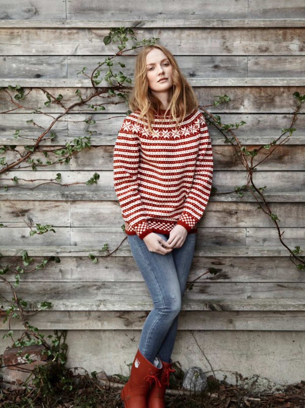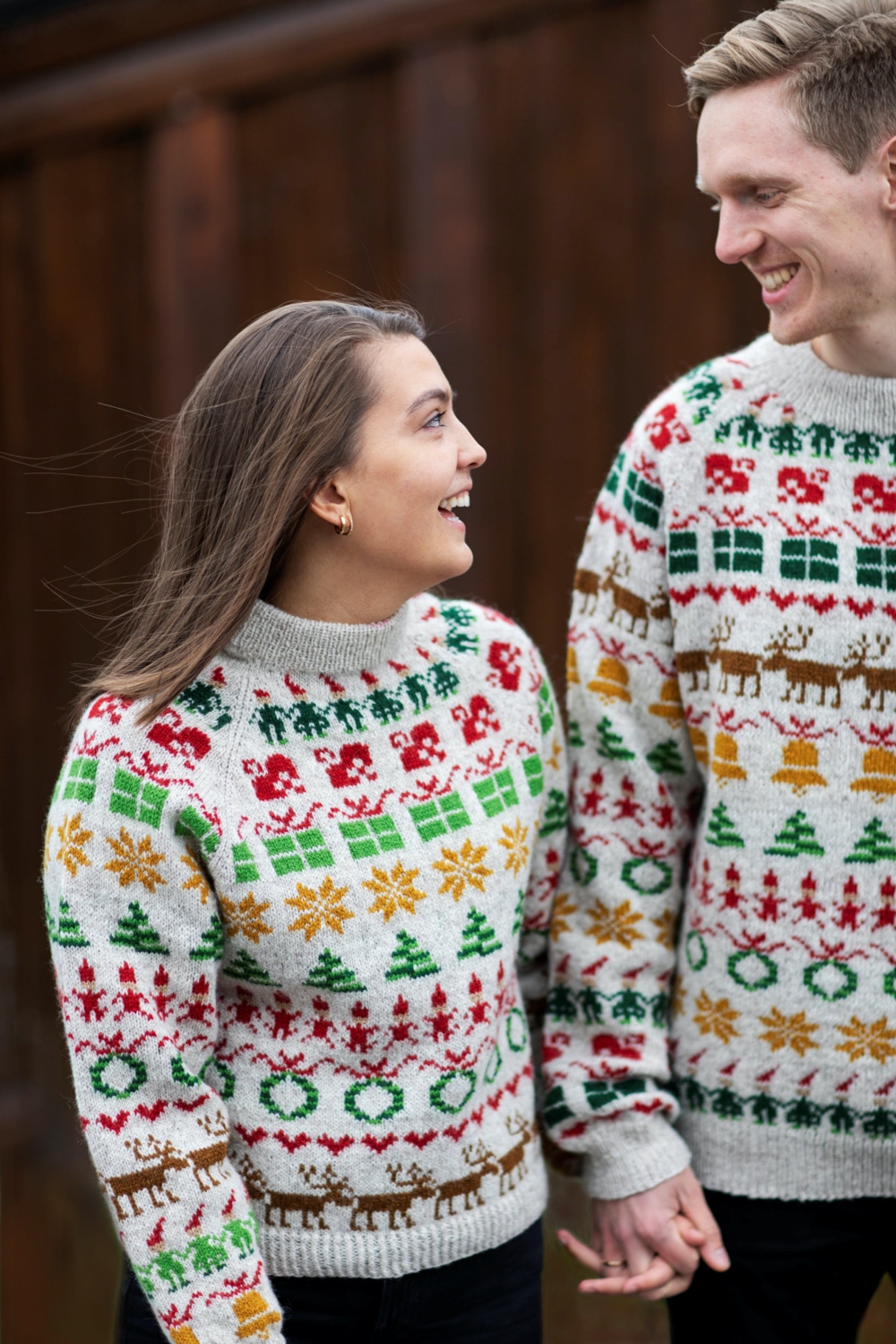 Julegenseren til dame er strikket ovenfra og ned i Finull. Finull Pt2 er et 2-tråds kardegarn av 100% norsk ull. Garnet gir lette og luftige plagg med lang levetid.