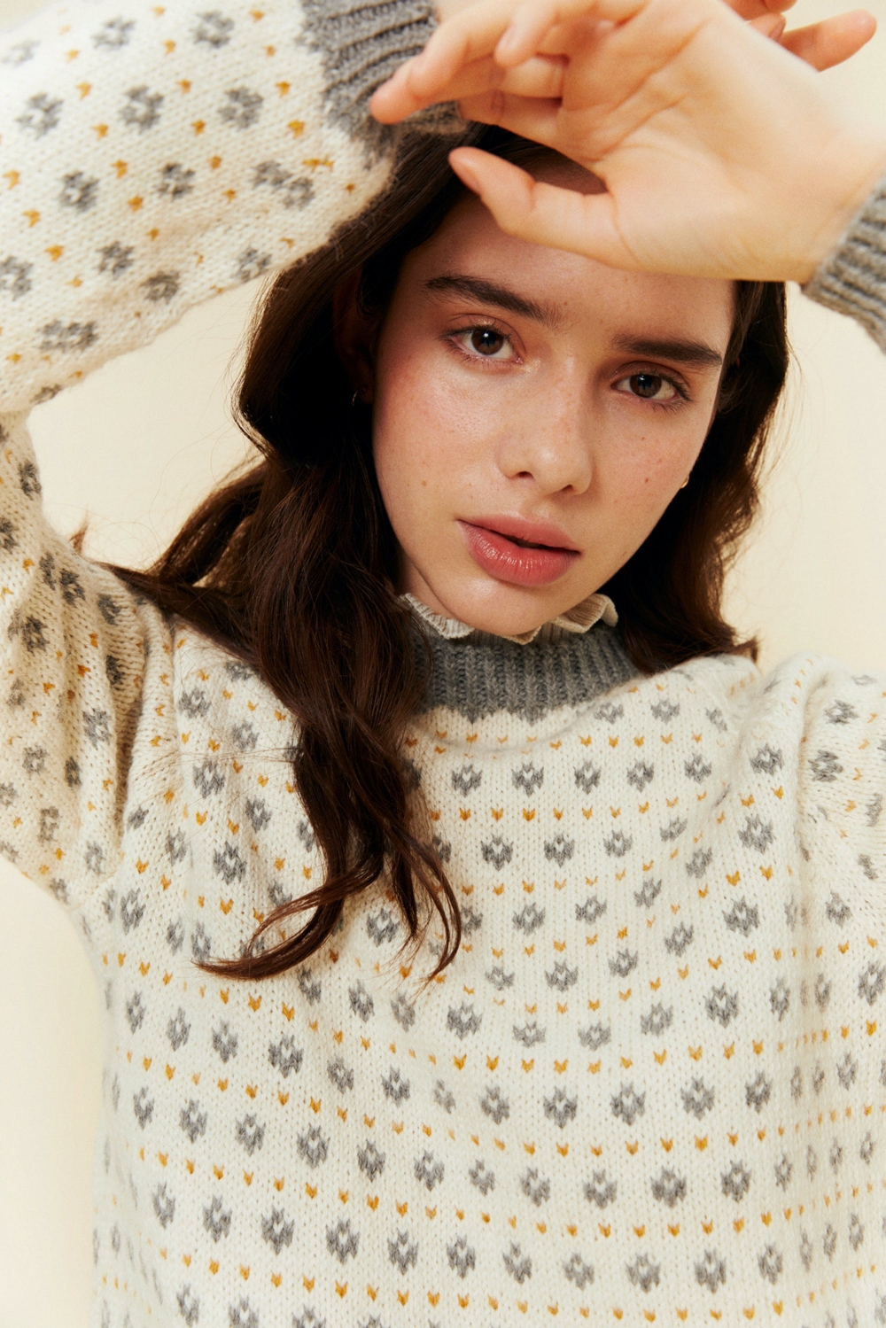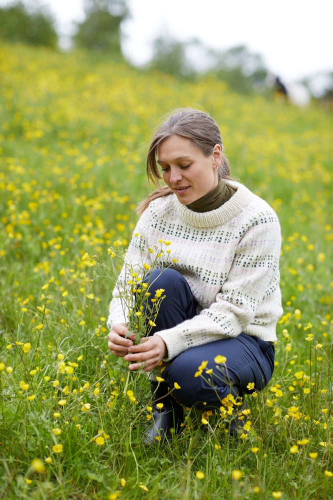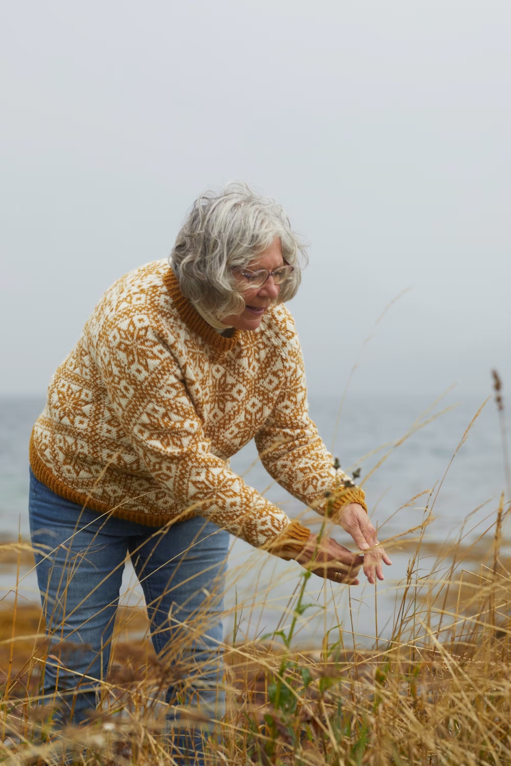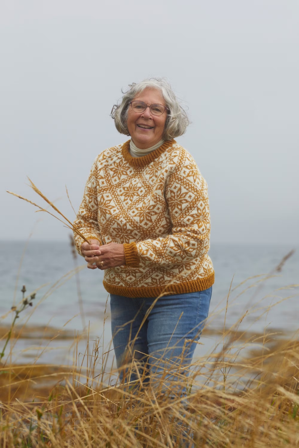 Ytterbakkegenser - en helmønstret genser strikket i én bunnfarge og seks mønsterfarger. Mønsteret er en vri på det tradisjonelle lus-mønsteret og i en morsom fargesetting. Strikkepakke inkl. garn og oppskrift.