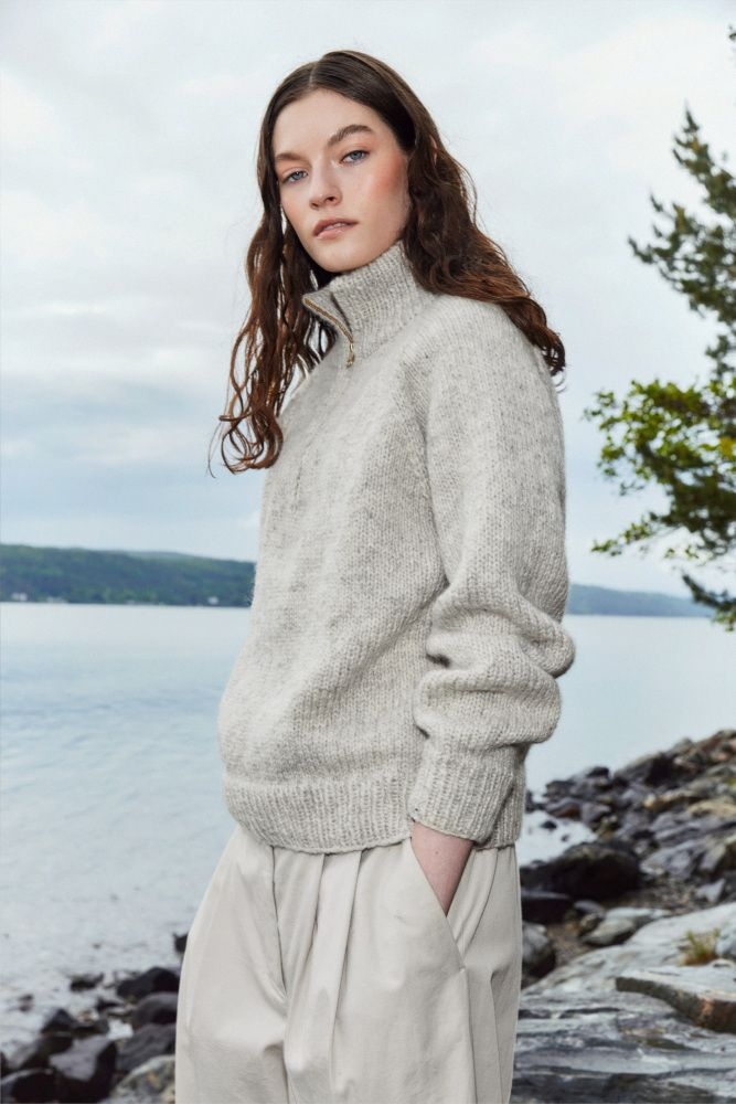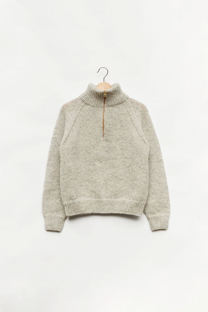 Zipper Sweater fra PetiteKnit strikket i Peer Gynt (100 % norsk ull, mykt og behagelig) og Tynn Silk Mohair fra Sandnes Garn. Strikkepakke med garn og oppskrift.