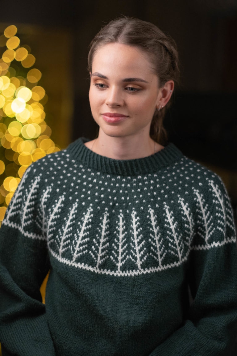 Strikkepakke med garn og oppskrift på Juleskog - Julegenser med snødekte grantrær