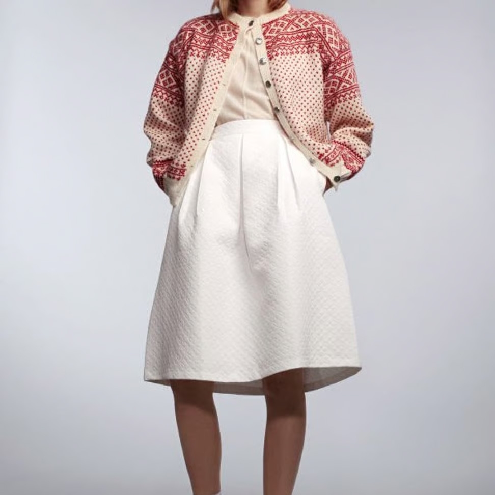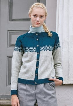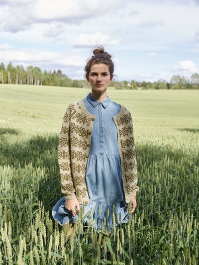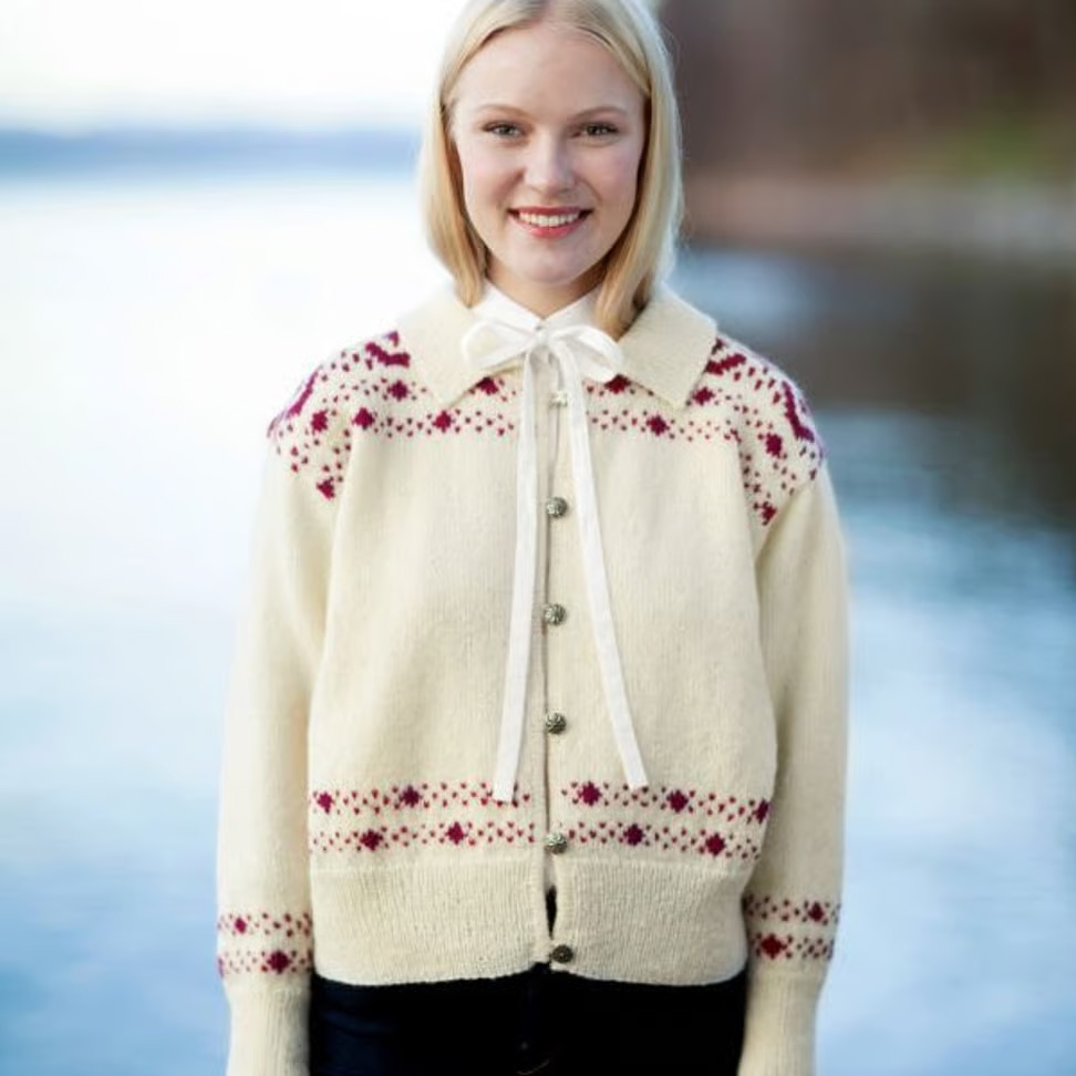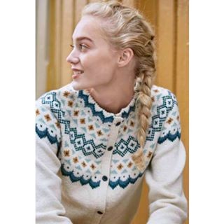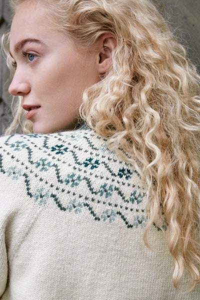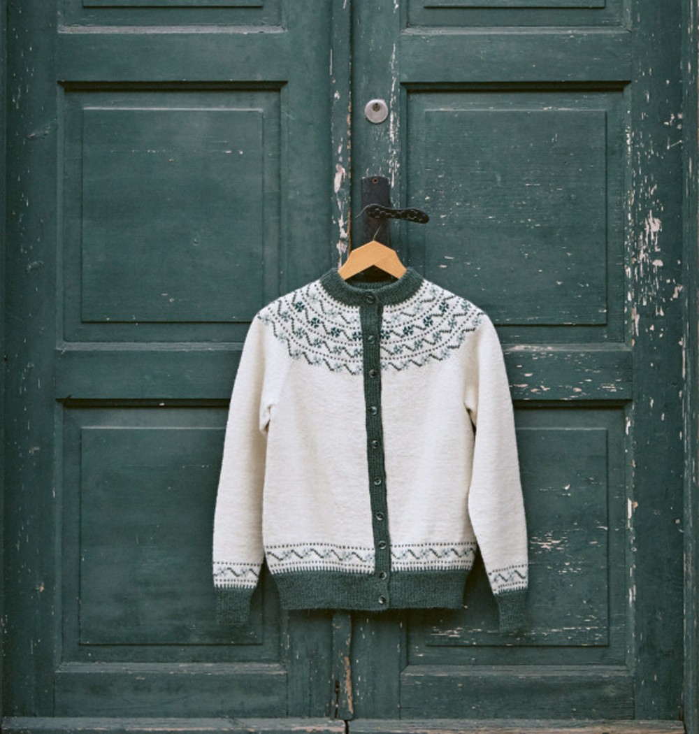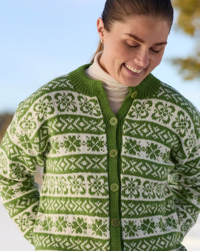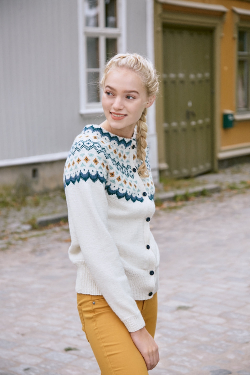 Vestfoldkofte til dame strikkes i Rauma Finullgarn - i denne pakken får du garn og oppskrift.