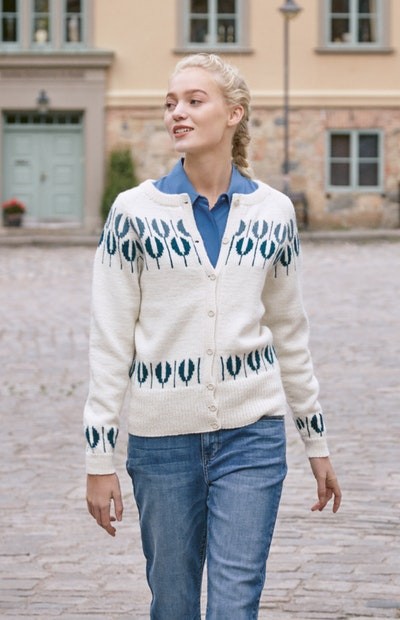 Strikkepakke med garn og oppskrift på Tulipankofte - I nydelig tradisjonstrikk som blir strikket i Tumigarn fra Raumagarn. Dette garnet er 50 % alpakka og 50 % ull.