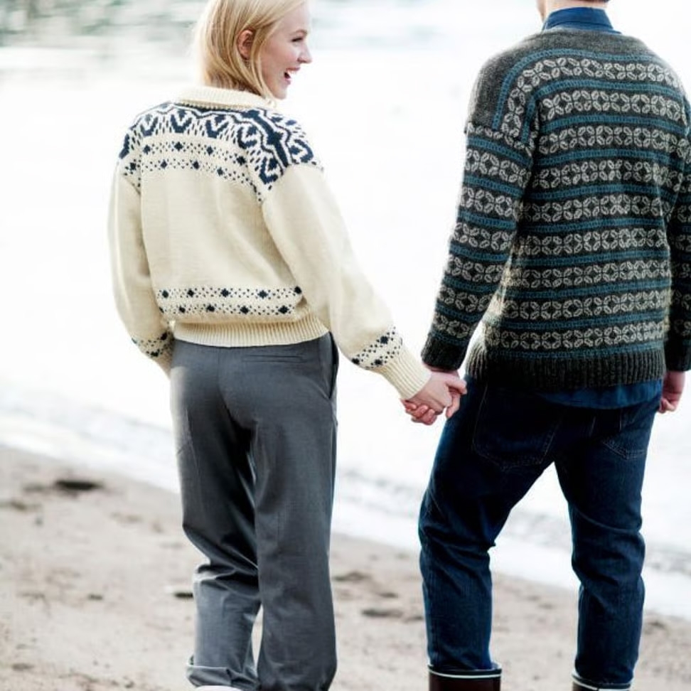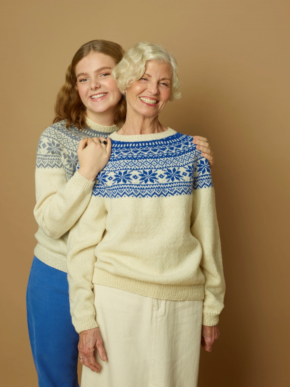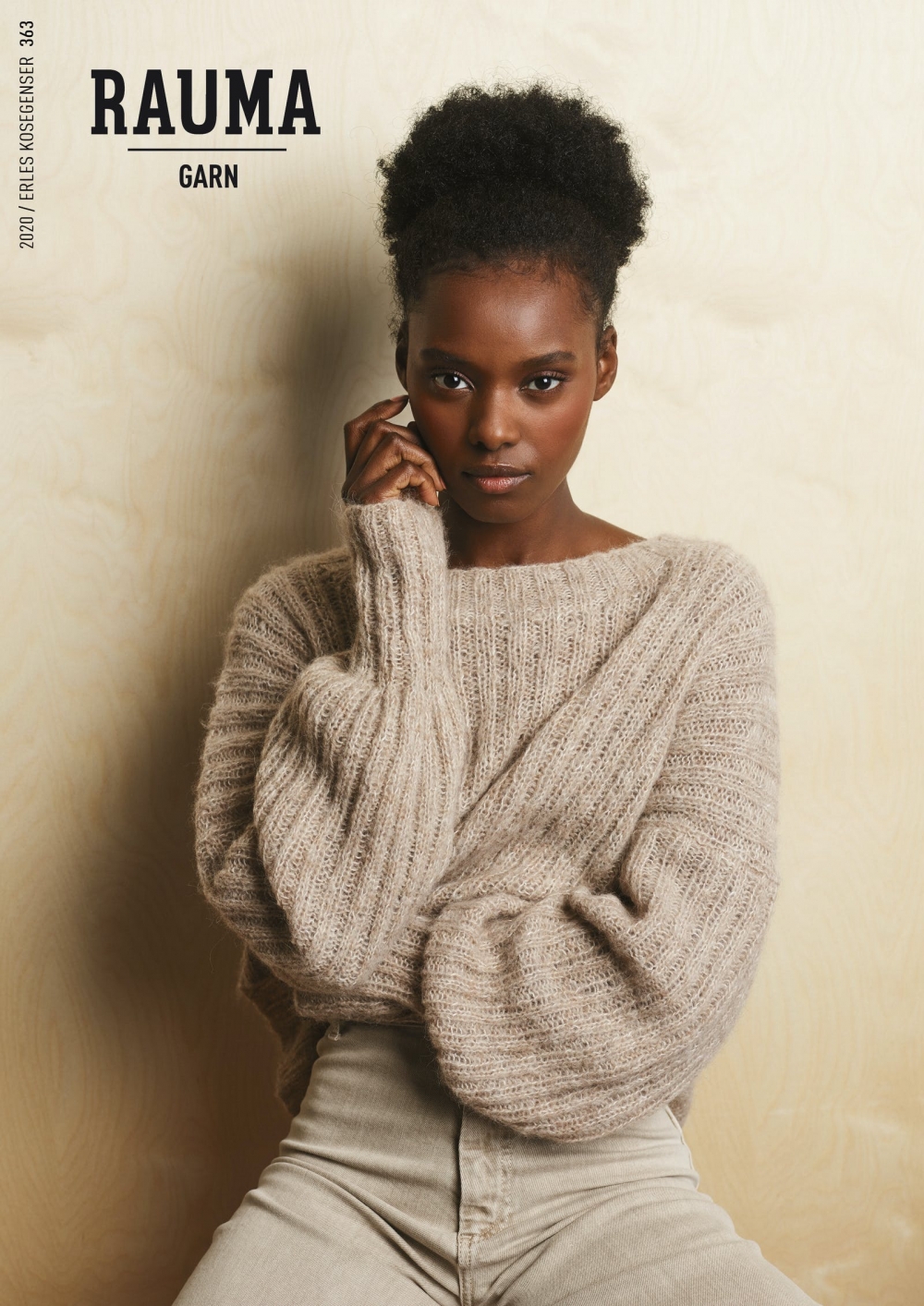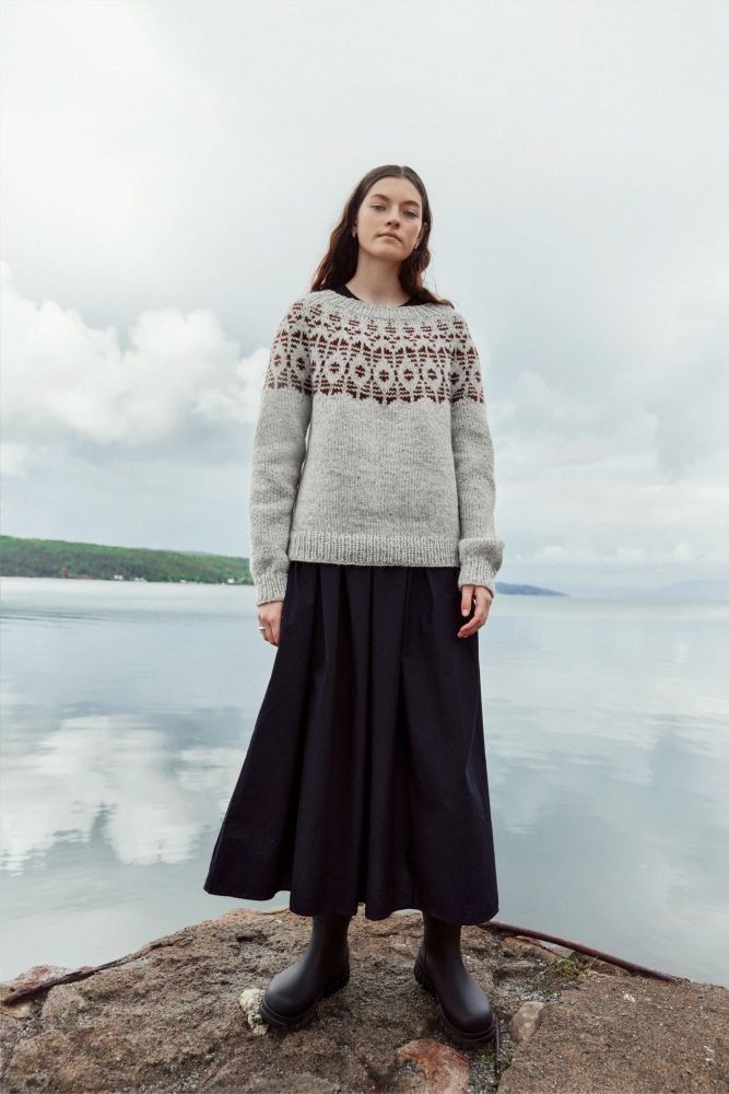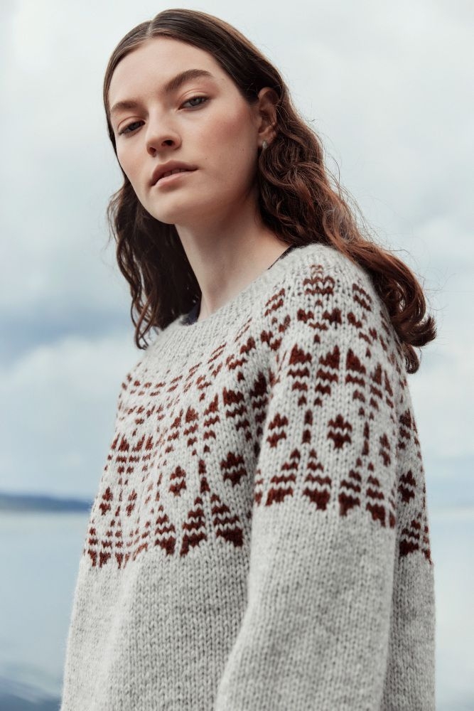 Strikkepakke med garn og oppskrift fra Rauma Garn. Fjære genser er mønstret i to farger. Den har en avslappet passform med raglan, rund hals og ribbestrikkede kanter. Genseren strikkes ovenfra og ned.