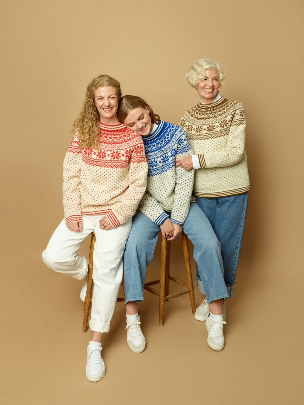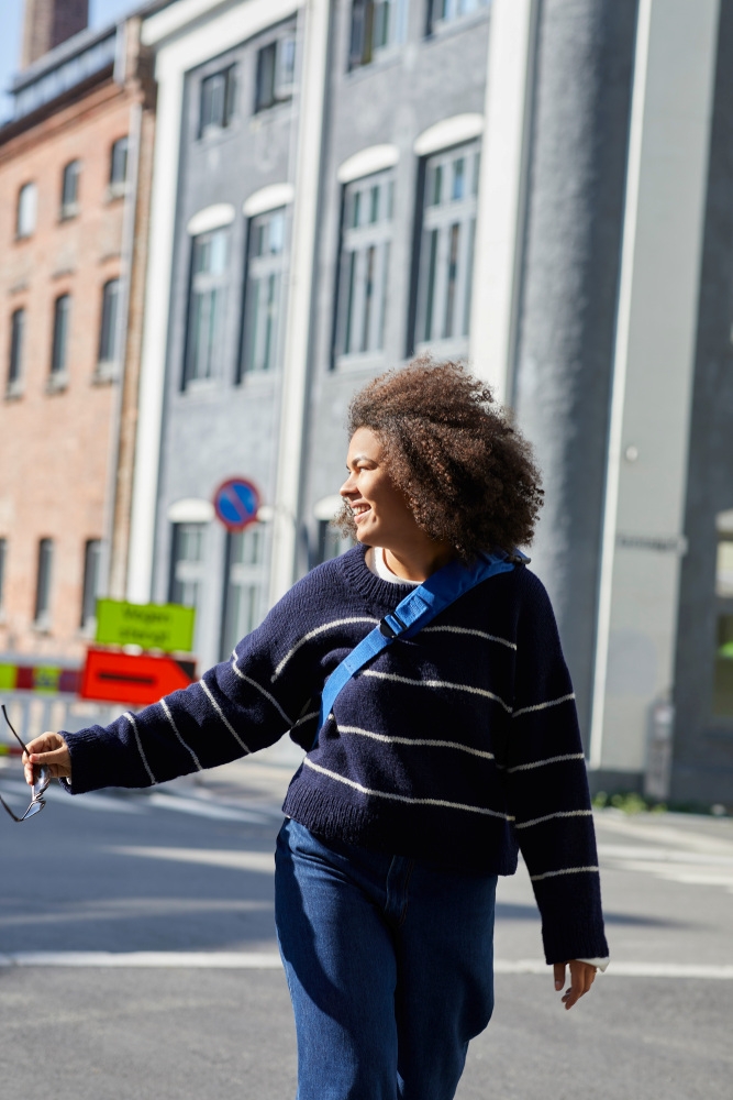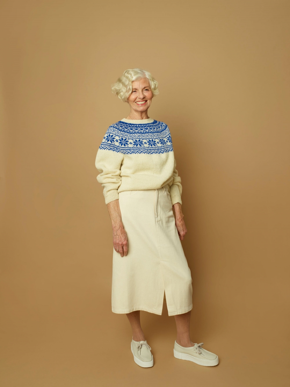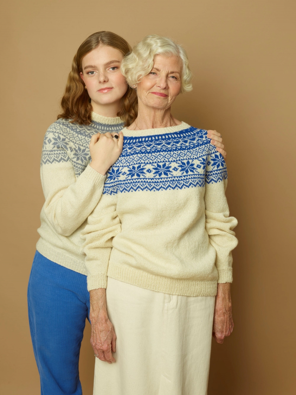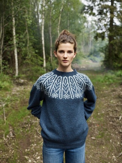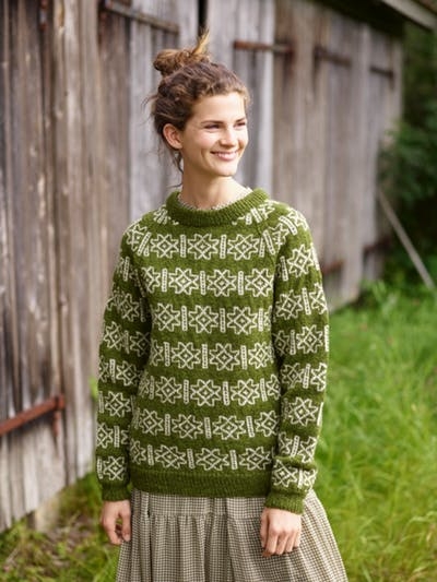 Strikkepakke med garn og oppskrift fra Rauma Garn. Fjære genser er mønstret i to farger. Den har en avslappet passform med raglan, rund hals og ribbestrikkede kanter. Genseren strikkes ovenfra og ned.