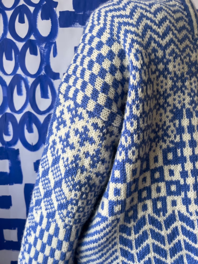 413-3 Skjærgårdsgenser Petunia blå og natur Strikkepakke