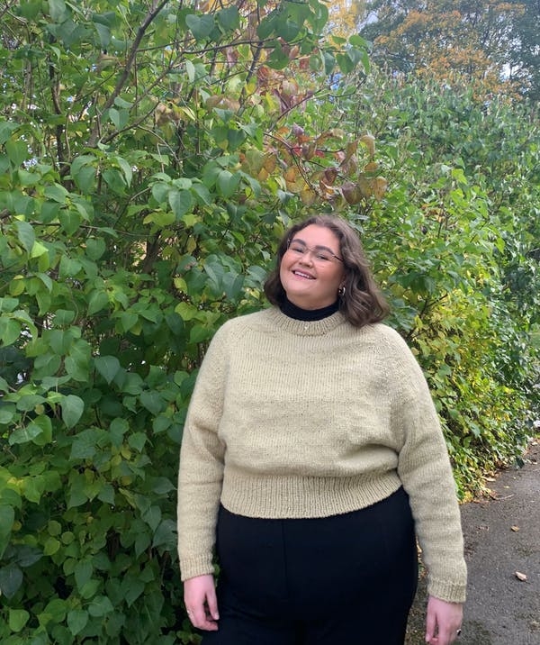 Denne genseren er en kort og vid modell. Den strikkes ovenfra og ned med forkortede omganger i halsen og med raglanøkninger. Inkl. oppskrift.