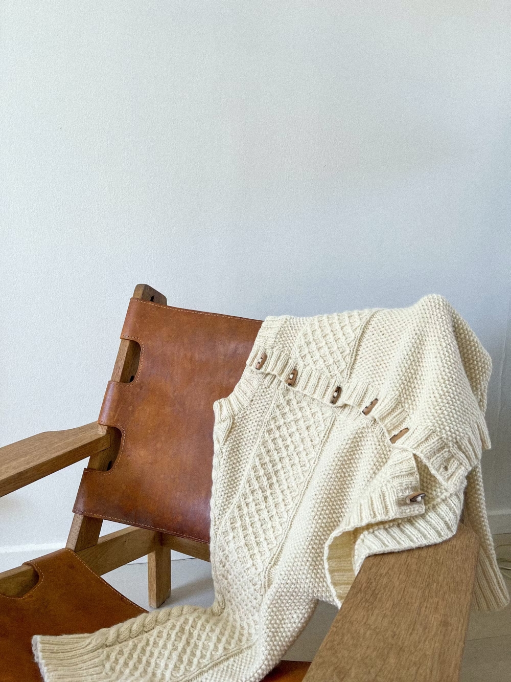 Strikkepakke på flettejakke i Fivel, pakke med garn og oppskrift.