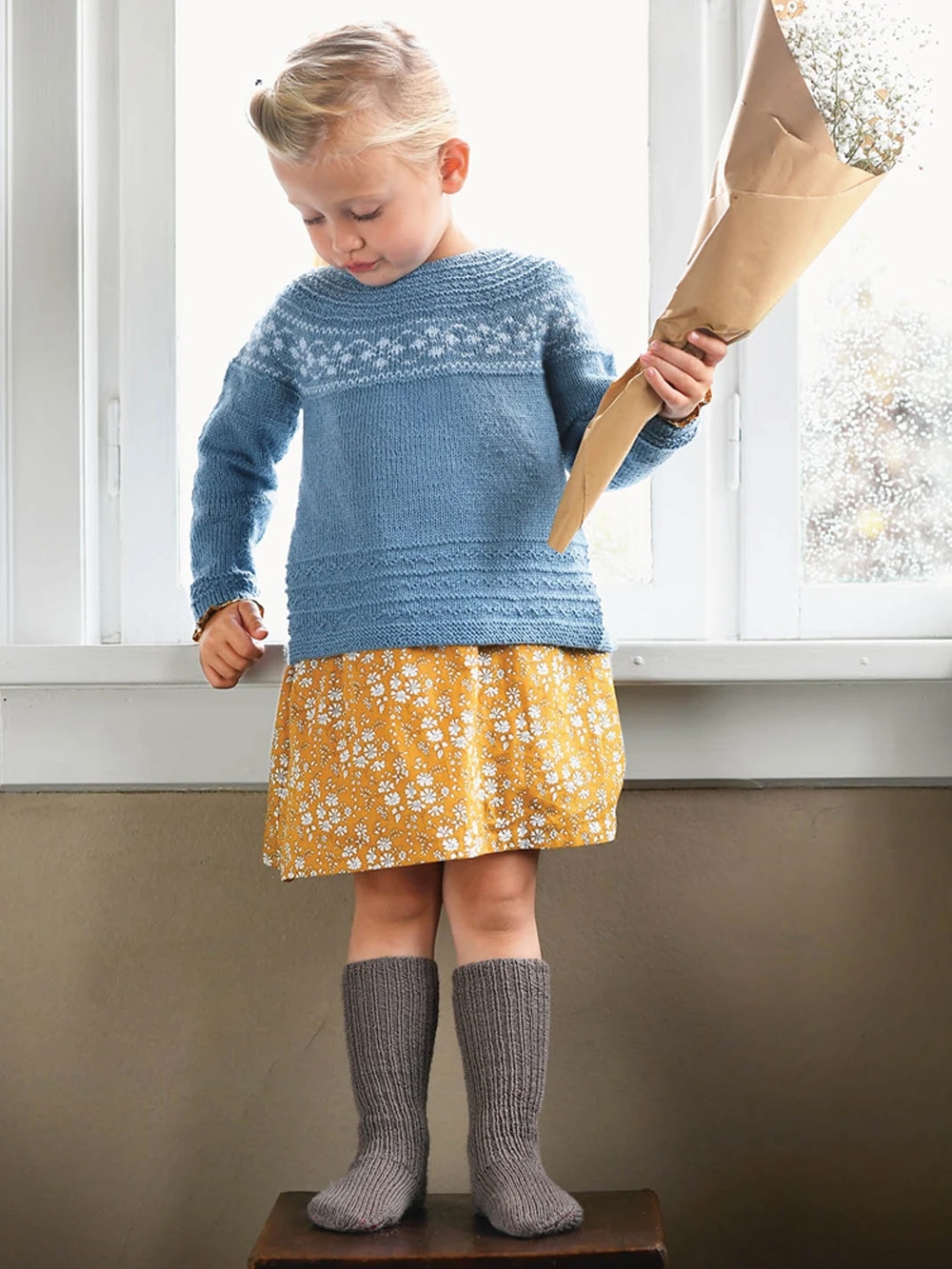 Raglangenser med mønster strikket i Sunday fra Sandnes Garn. Strikkepakken er med garn og oppskrift.