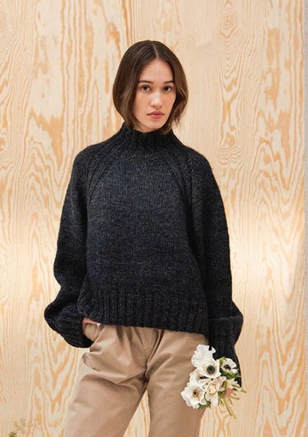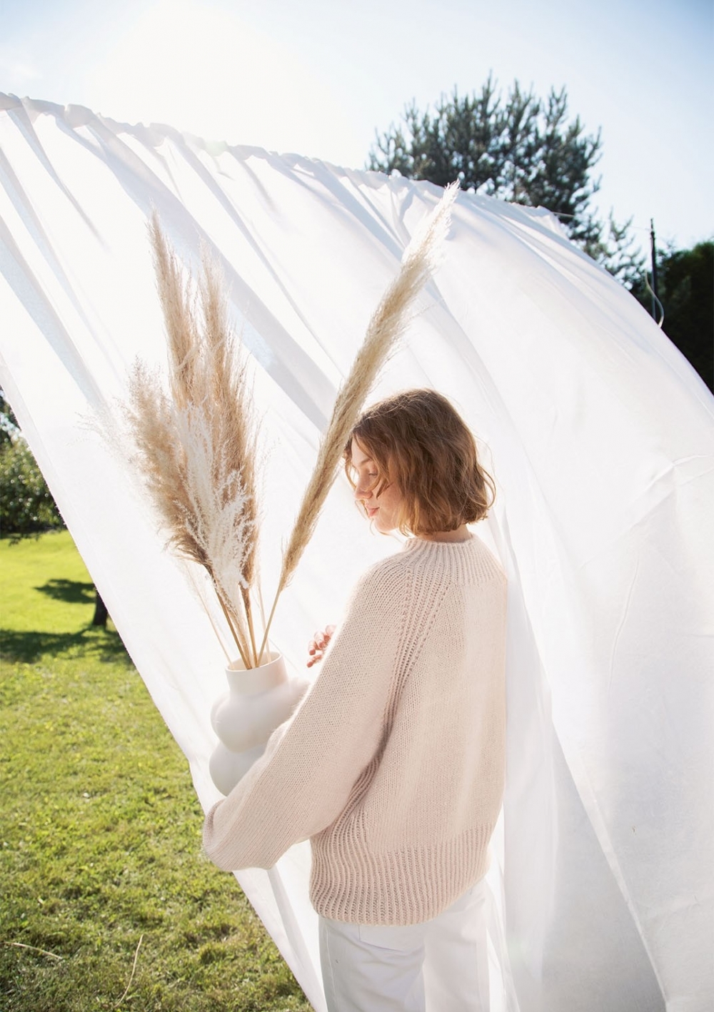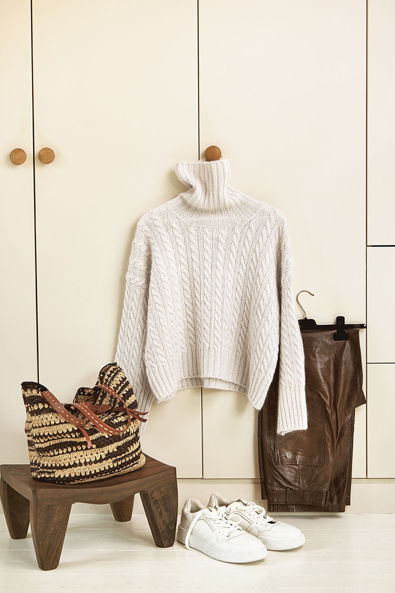 Strikkepakke med garn og oppskrift på Chunky Dahlia dame genser som strikkes i KOS og Tynn Silk Mohair Lys beige