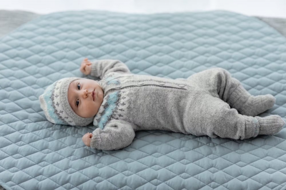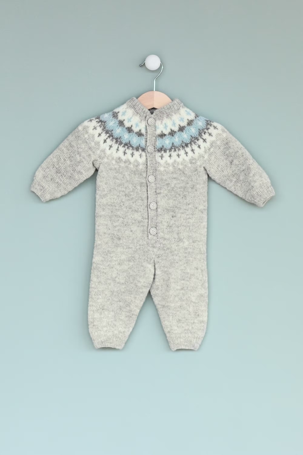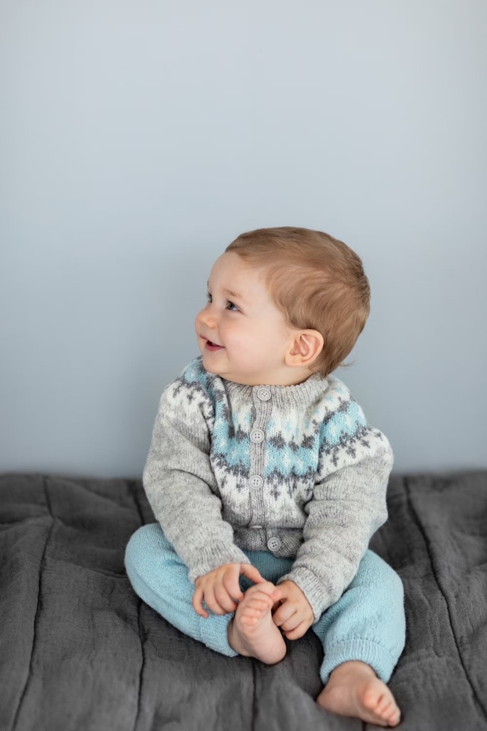279-2 Vardejakke baby Lamullgarn lys grå blå