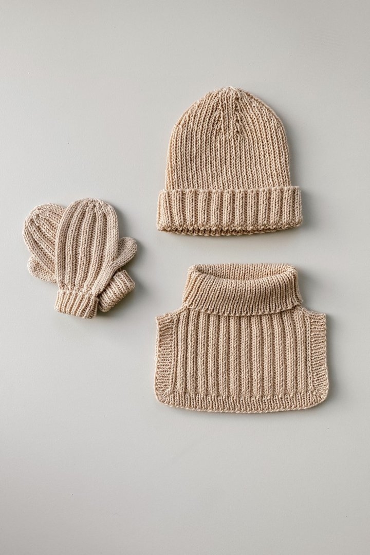 Norsk strikkeoppskrift. (selges kun sammen med garn). Settet selges også som separate oppskrifter. Et sett bestående av lue, hals og votter i ribb-struktur. Oppskriften selges kun sammen med garn.