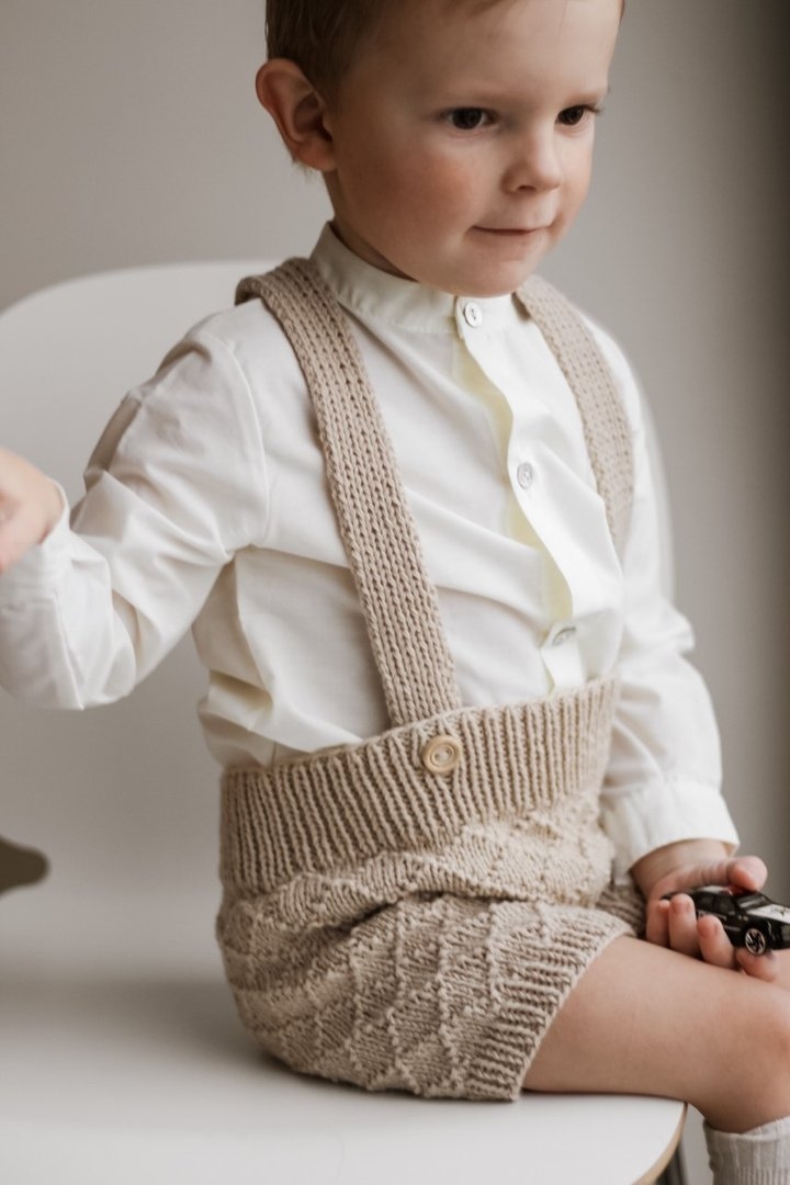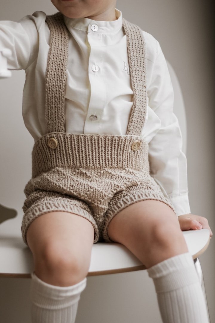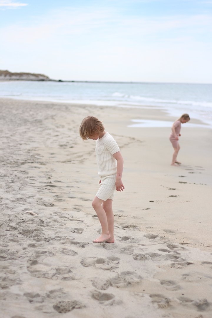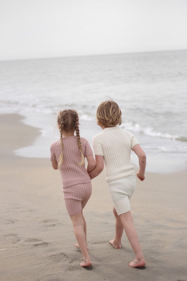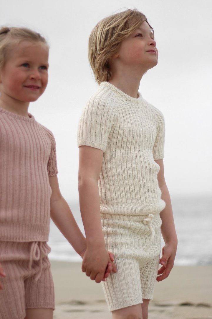 Norsk strikkeoppskrift. Settet består av shorts og t-skjorte i dobbel ribb-struktur, som vokser med barnet! Plaggene strikkes ovenfra og ned på pinne 3 mm, slik at du enkelt kan justere lengden på ermer og ben selv.