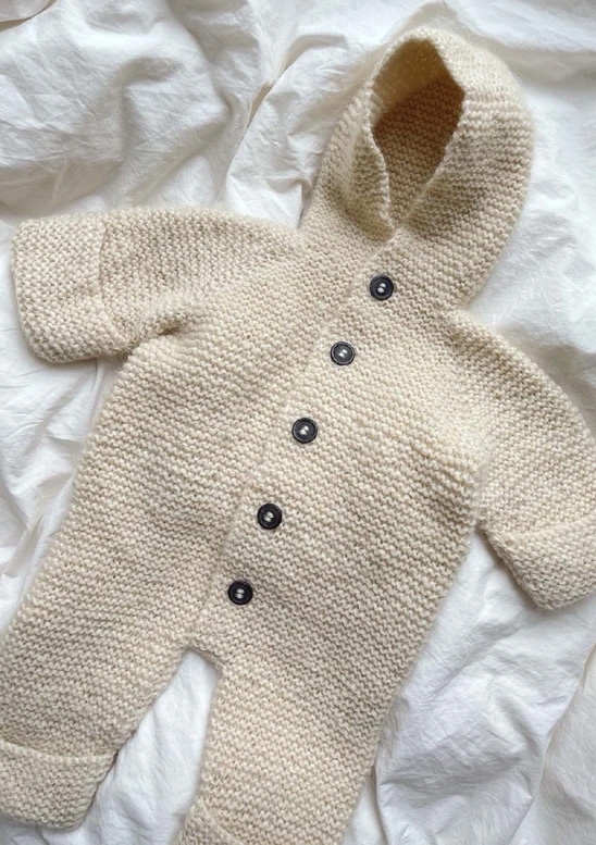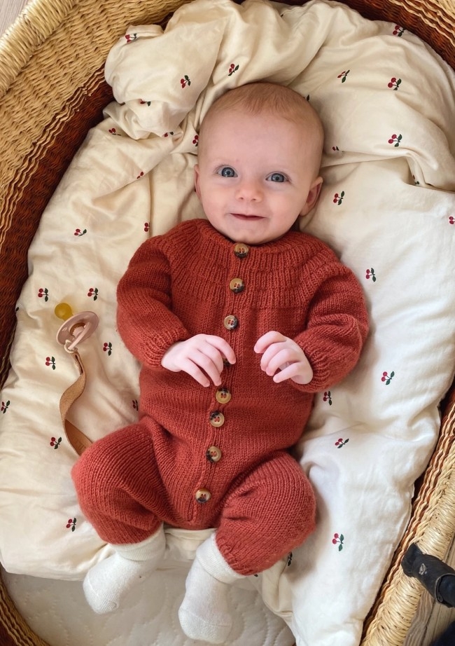 PetiteKnit - Enkeltoppskrift 52 – Drakt til baby, strikket ovenfra og ned i SUNDAY PetiteKnit (fargen på bilde er Brick 3536). Oppskriften selges kun sammen med garn.