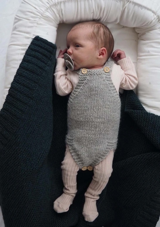 PetiteKnit - Enkeltoppskrift 52 – Drakt til baby, strikket ovenfra og ned i SUNDAY PetiteKnit (fargen på bilde er Brick 3536). Oppskriften selges kun sammen med garn.