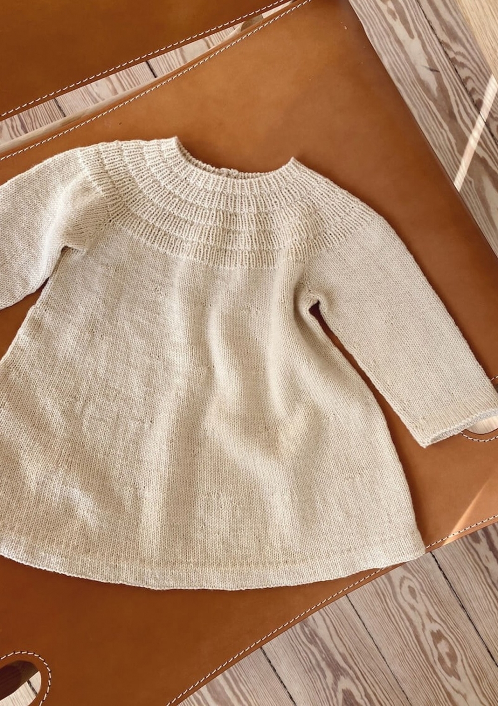PetiteKnit – Enkeltoppskrift 105 – Kjole til baby og barn, strikkes ovenfra og ned i Sunday PetiteKnit.