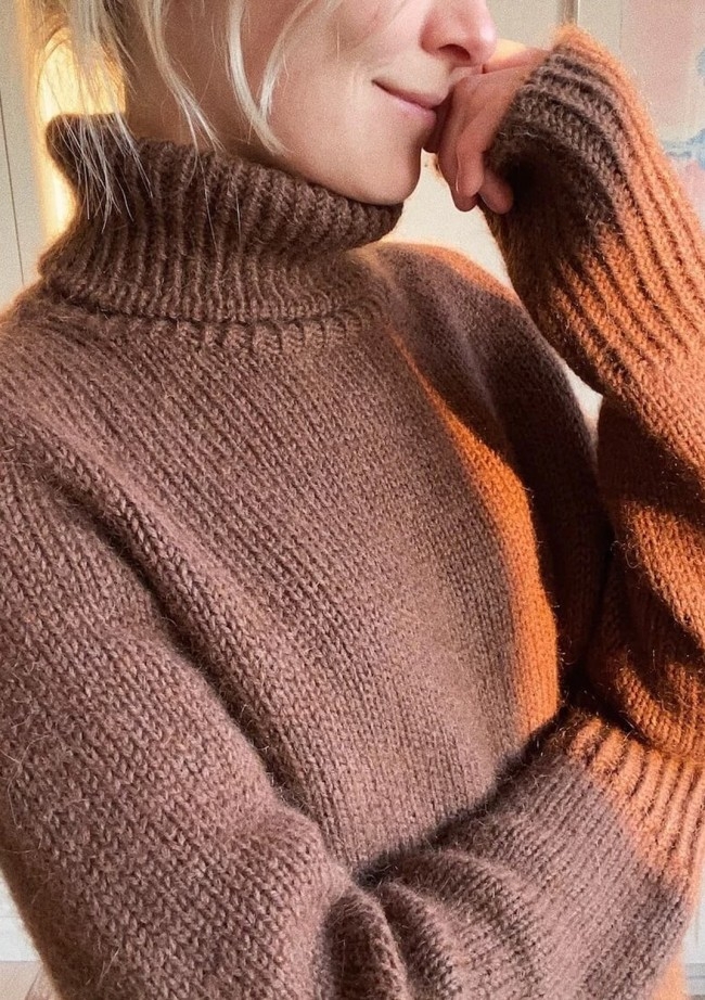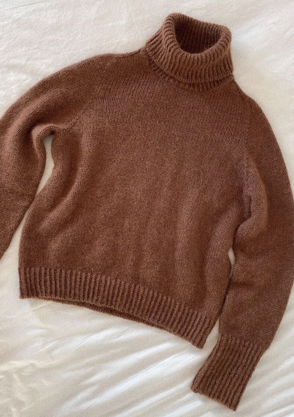 Oppskrift på høyhalset genser strikket med en tråd Sunday og en tråd Tynn Silk Mohair fra Sandnes Garn. Design av PetiteKnit. Oppskriften selges sammen med garn.