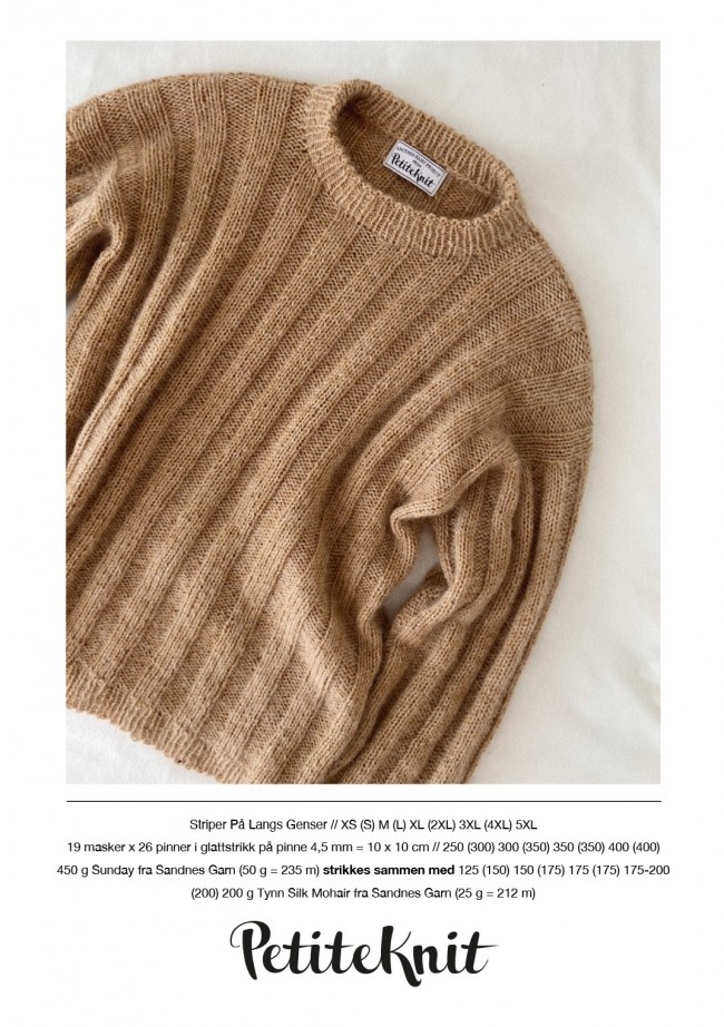 Oppskrift på Striper på Langs-genser fra PetiteKnit. Strikkes i Sandnes Sunday og Tynn Silk Mohair.