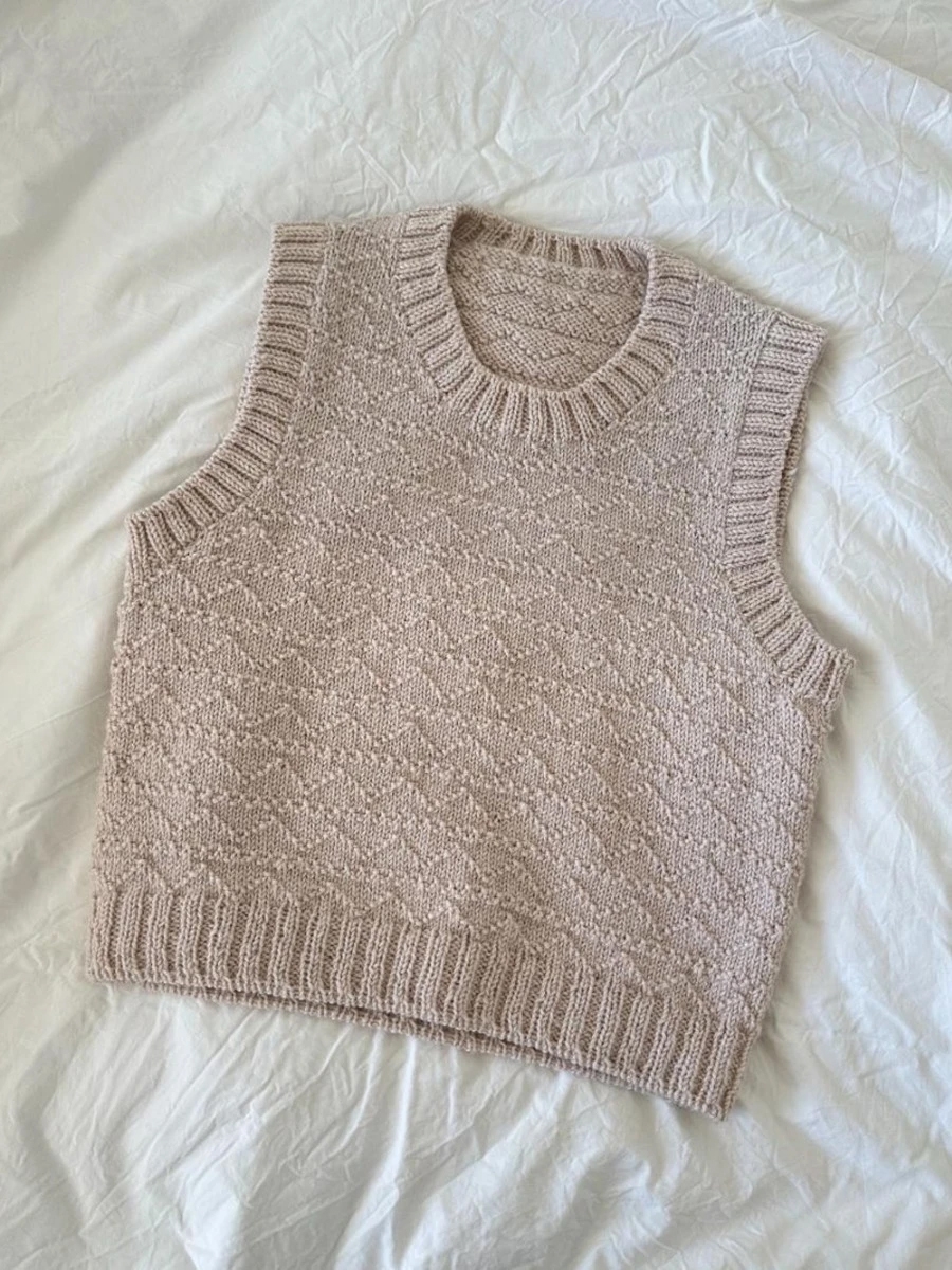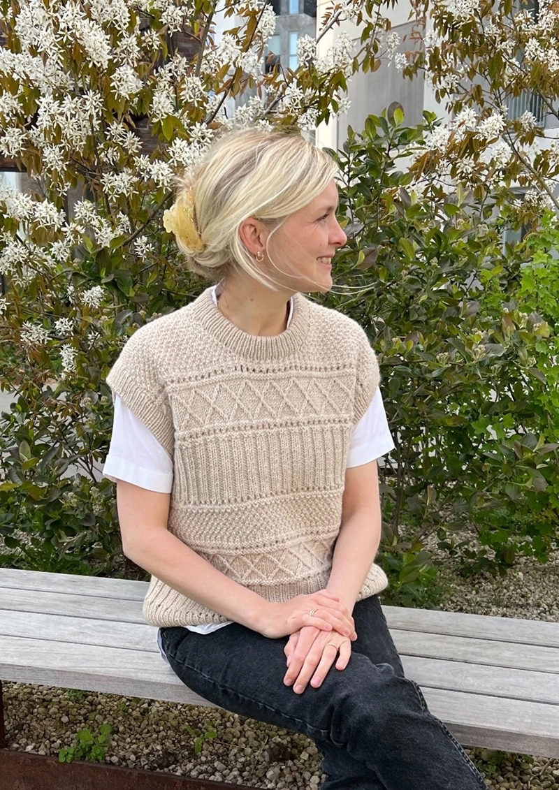 PetiteKnit - Enkeltoppskrift 89 – Vest til dame, strikkes ovenfra og ned i patentstrikk med Peer Gynt. Dette er et samarbeid mellom Sandnes Garn og PetiteKnit. På bakgrunn av dette samarbeidet selges denne oppskrift kun sammen med garn til hele plagget
