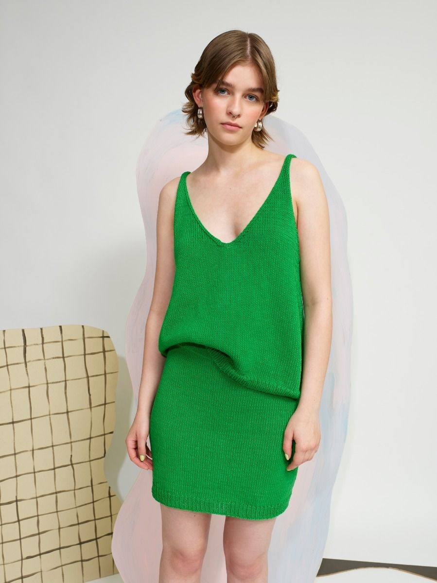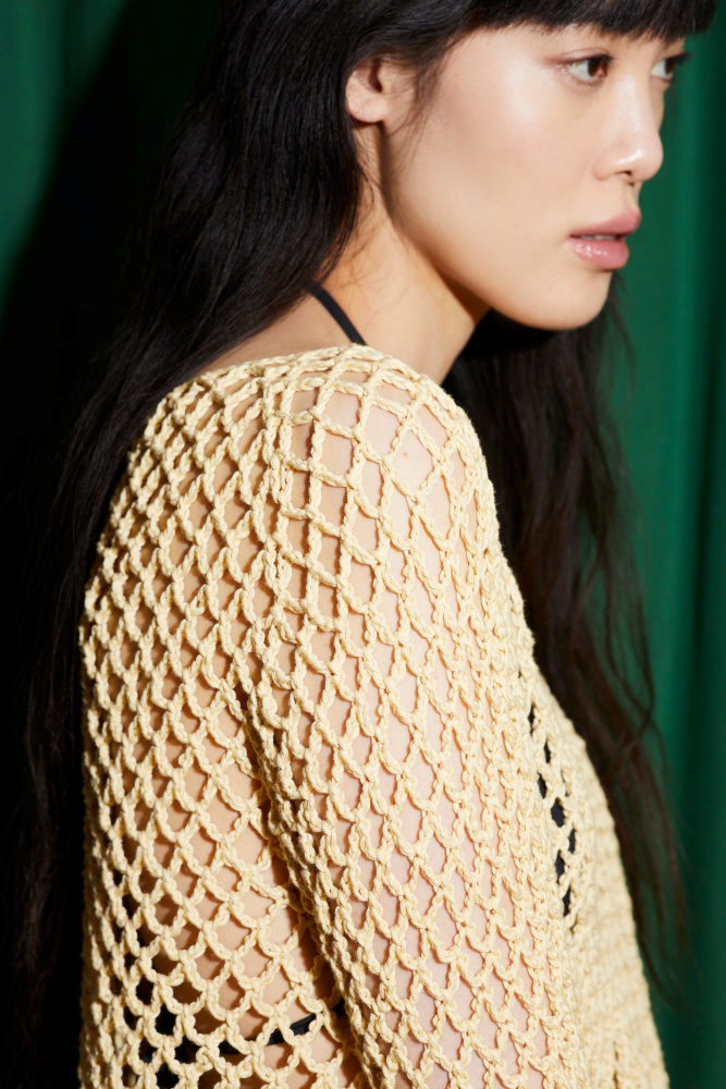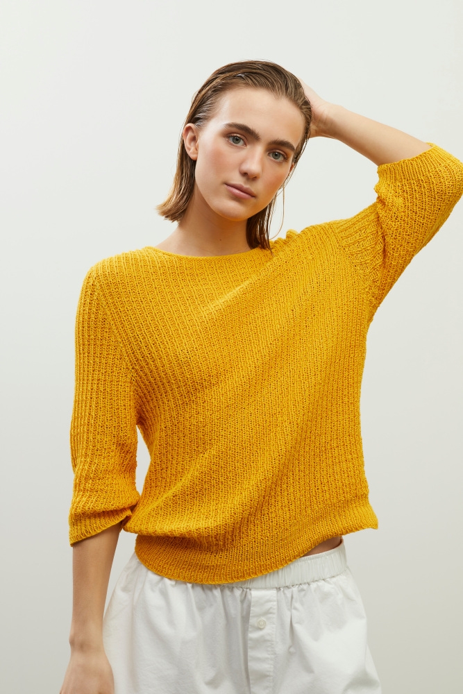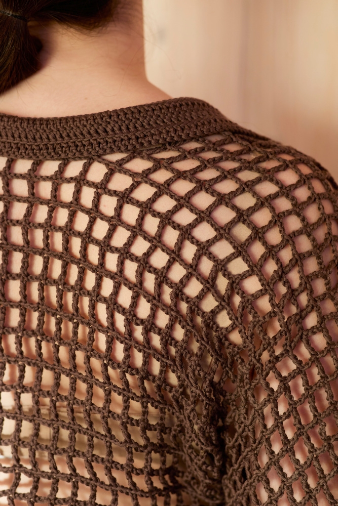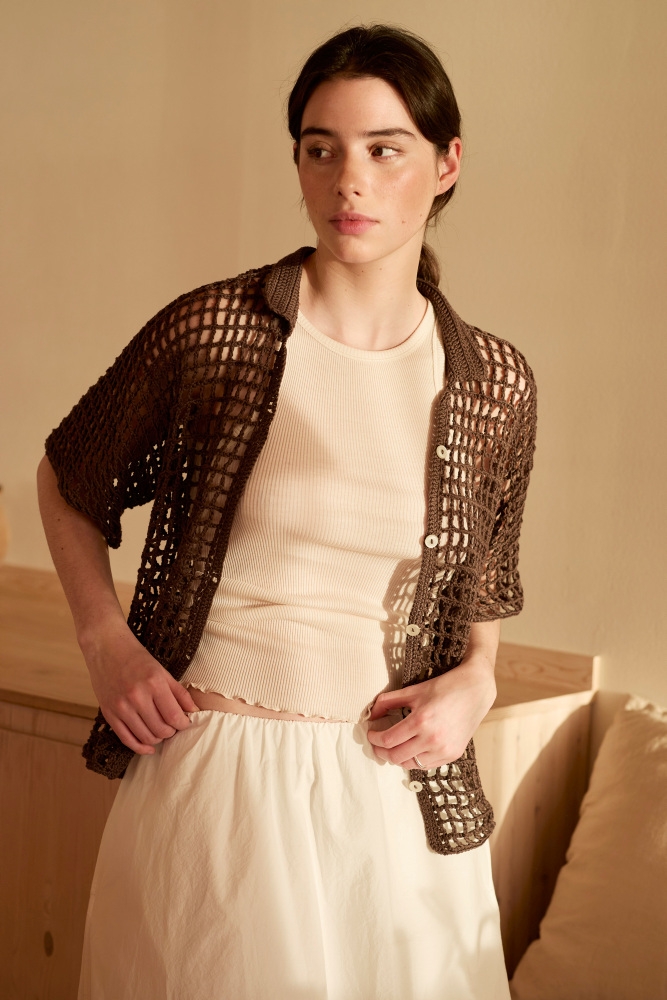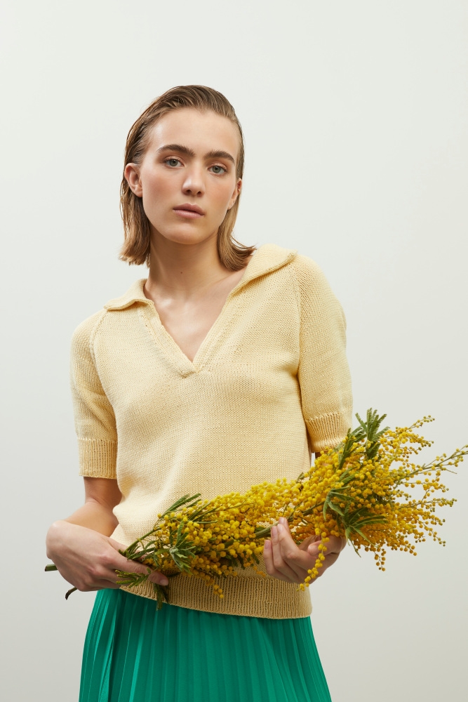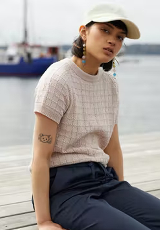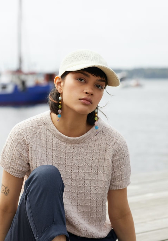 Dorgetrøye er en sommerlig glattstrikket topp med rundt bærestykke og korte ermer. Vi selger oppskriften kun sammen med garn til hele plagget (fra Rauma Garn)