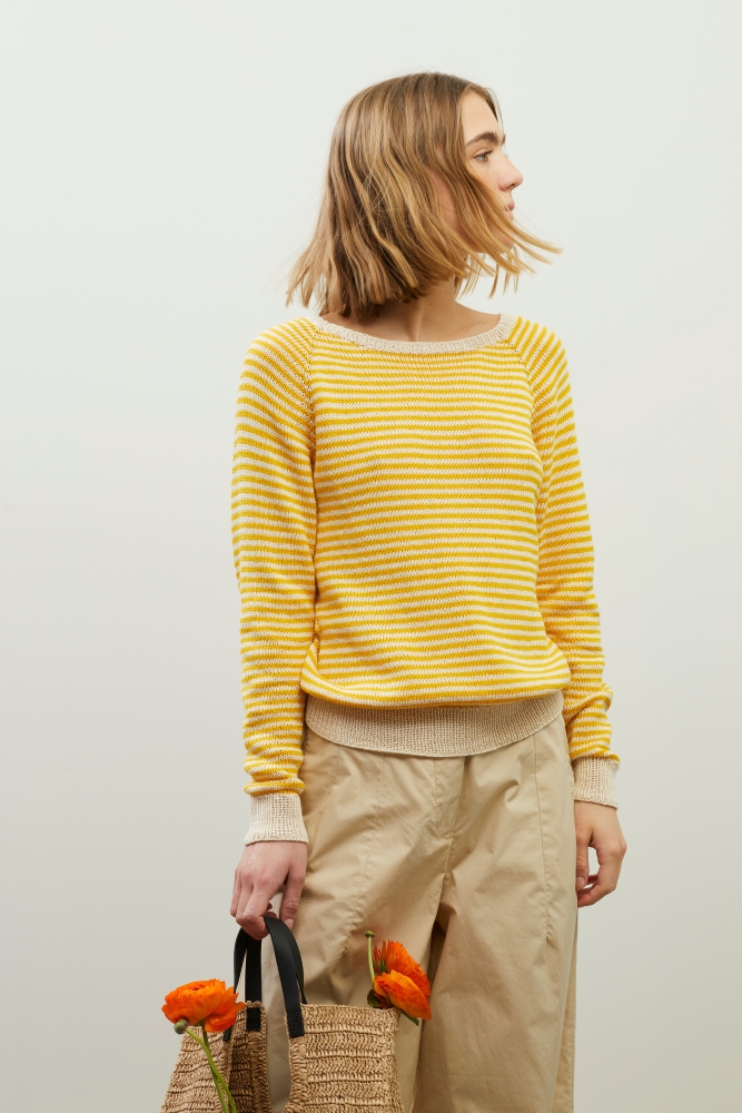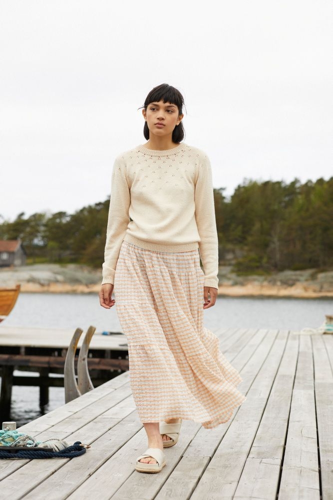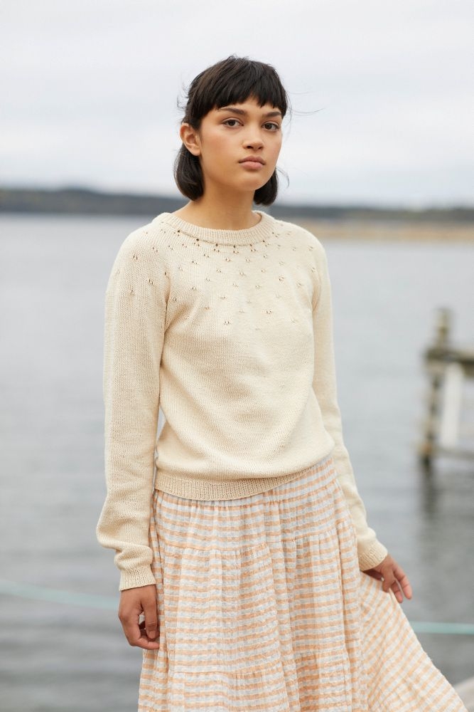 Skjærgårdsgenseren er en romslig raglangenser med striper og ¾-lange ermer. Vi selger oppskriften kun sammen med garn til hele plagget (fra Rauma Garn)