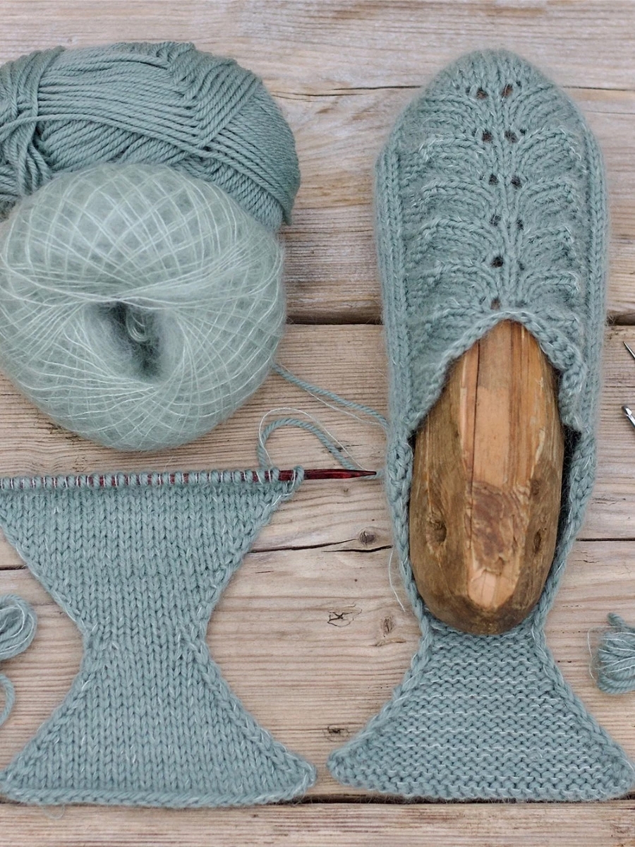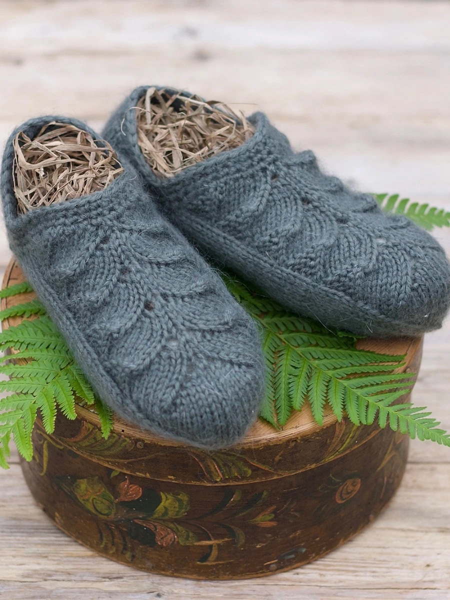 Hjertetøfler med heklekant strikket i Fritidsgarn og tovet. (Oppskriften selges kun sammen med garn)