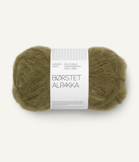 Børstet Alpakka består av alpakkafiber tvunnet sammen med en sterk nylontråd, som holder det hele sammen når alpakkafibrene blir børstet opp. Dette gir et mykt, lett og luftig garn med et loddent uttrykk.