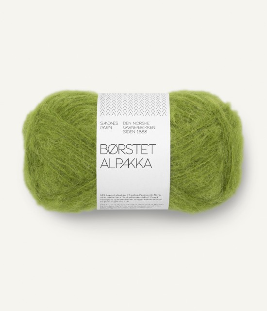 Børstet Alpakka består av alpakkafiber tvunnet sammen med en sterk nylontråd, som holder det hele sammen når alpakkafibrene blir børstet opp. Dette gir et mykt, lett og luftig garn med et loddent uttrykk.