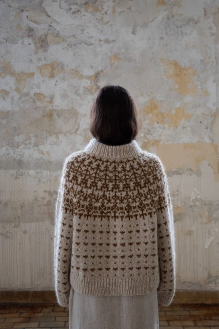 – Farge B (mønsterfarge): Luna lamullgarn i fargen 440 okerbrun (200 m pr 100g), strikkes sammen med Isager Silk Mohair i fargen 63 (212 m pr 100g).