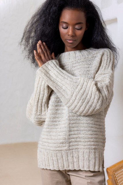 Holly genser er en løst strikket, lett oversized genser som strikkes i myke Luna Lamullgarn.
