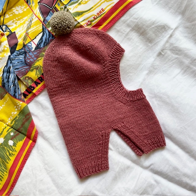 Elisenberg balaclava Light strikkes ovenfra og ned i glattstrikk. Balaclavaen har en litt løs passform som ikke sitter stramt rundt halsen. Først strikkes toppen med økninger. Deretter felles det masker til ansiktsåpning og det strikkes frem og tilbake før det igjen samles rundt på pinnen. Balaclavaen avsluttes i et for- og bakstykke. Til slutt plukkes det opp masker rundt ansiktsåpningen og det strikkes vrangbord.