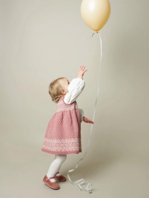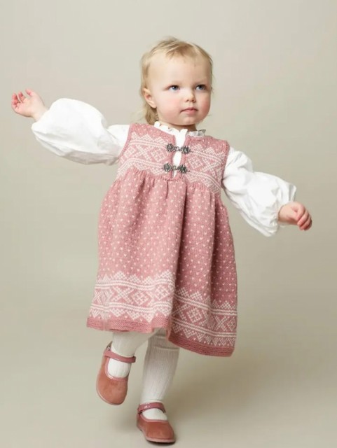 Kjolen strikkes rundt nedenfra og opp. Overdelen har åpning midt foran som syes og klippes opp før forkantene strikkes på. Kjolen lukkes foran på livstykket med hekter.