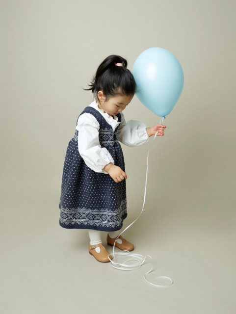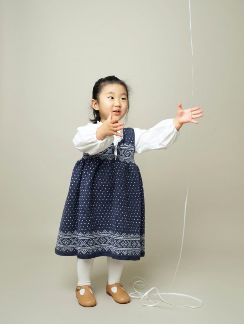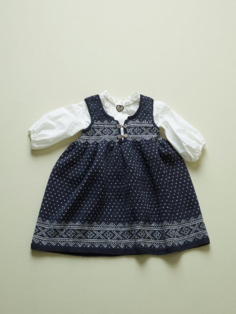 Kjolen strikkes rundt nedenfra og opp. Overdelen har åpning midt foran som syes og klippes opp før forkantene strikkes på. Kjolen lukkes foran på livstykket med hekter.