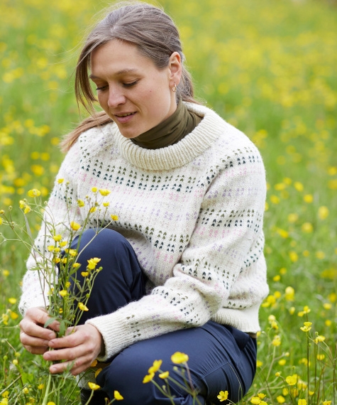 Ytterbakkegenser til dame er en helmønstret genser strikket i én bunnfarge og seks mønsterfarger. Mønsteret er en vri på det tradisjonelle lus-mønsteret og i en morsom fargesetting. Genseren har en kort, rett og avslappet fasong med rund hals. Genseren er strikket ovenfra og ned med. Først strikkes en halskant som skal brettes dobbel. Ringningen formes ved hjelp av vendepinner, samtidig som det økes til raglan. Mellom raglanøkingene strikkes det en liten mønsterbord. Etter raglanøkingene deles arbeidet, og bol og ermer strikkes hver for seg. For en avslappet passform, velg en størrelse som er 14-26 cm større enn din egen brystvidde.