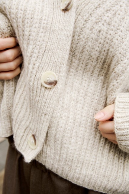 Kort Dagmarjakke er en moderne og stilren jakke i halvpatent, som strikkes ovenfra og ned i myk, norsk lamull. Jakken har european shoulder-konstruksjon og dyp v-hals. Ermene formes ved å felle på yttersiden, noe som gir synlige og dekorative linjer i plagget. Halvpatent gir dybde, tekstur og et luksuriøst uttrykk, og den myke lamulla gir følelsen av å bli omfavnet av et mykt og lunt pledd. Kort Dagmarjakke er en kort versjon av den lange Dagmarjakken, og i tillegg har stilige “utenpå”-lommer.