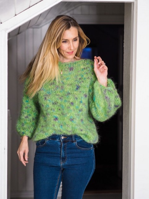 Bella color fra Permin 75 % kid mohair, 20% ull, 5 % polyamid, 50 g = ca 145 m.