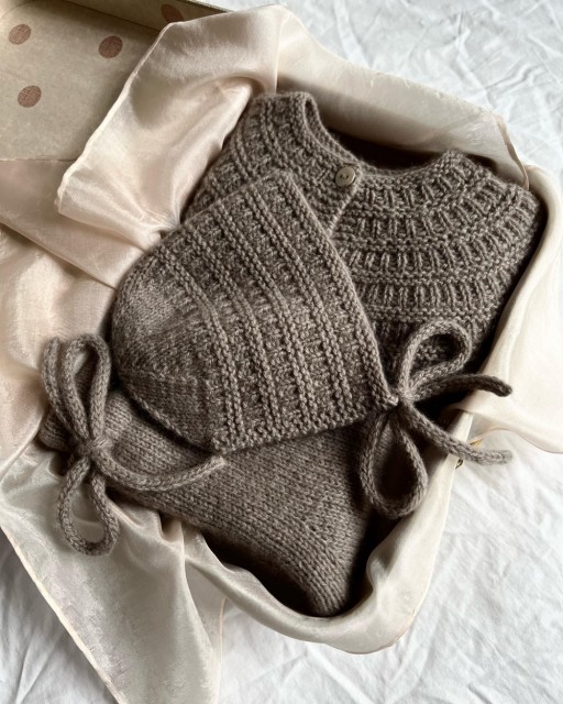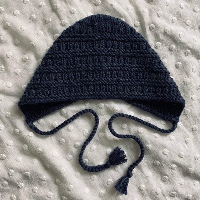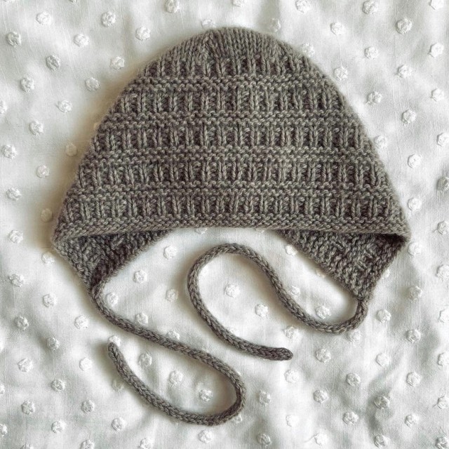 Sorgenfri kyse strikkes frem og tilbake på pinnen i strukturstrikk fra pannen og bakover. Deretter strikkes bakhodet i glattstrikk rundt på settpinner med fellinger. Til slutt strikkes en i-cord snor i hvert hjørne av kysens nedre kant.