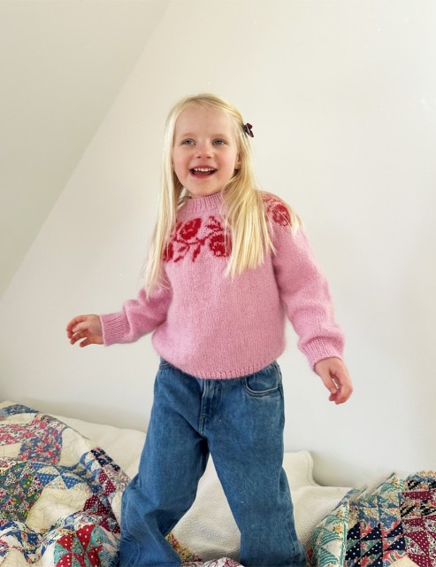 Størrelsene (2) 4 (6) 8 (10) 12 år tilsvarer en høyde på ca. (92) 104 (116) 128 (140) 152 cm og en personlig overvidde på ca. (54) 57 (62) 66 (71) 77 cm. Velg den størrelsen som passer best med barnets overvidde. Det er enkelt å regulere lengden på bol og ermer da genseren strikkes ovenfra. Rosie Yoke Sweater junior er ment å ha en bevegelsesvidde (positive ease) på ca. 16-21 cm. På bildene er den vist med en bevegelsesvidde på ca. 17 cm.