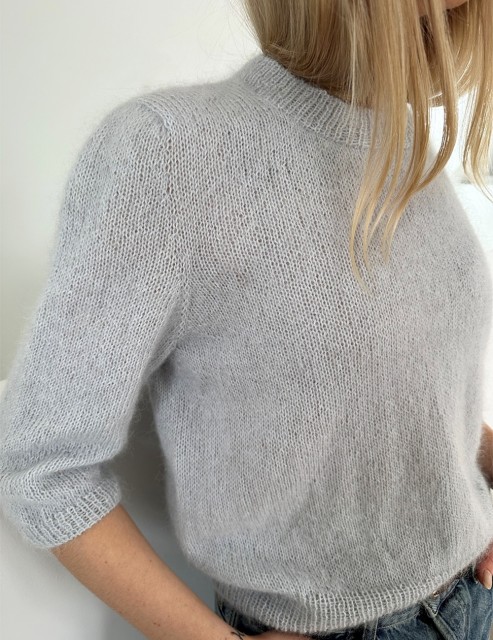 Først strikkes bakstykkets øverste del fra de skrå skuldrene og et lille stykke ned på bakstykket. Deretter strikkes det opp masker til forstykket langs bakstykkets skuldermasker. Hver side av forstykkets øverste del strikkes for seg. Forstykkets skrå skuldre formes først med vendepinner. Deretter strikkes det opp masker til toppen av ermet, og ermer, forstykke og bakstykke strikkes på én gang til slutten av ermehullet. Herfra strikkes bol og ermer ferdig for seg. Til slutt strikkes det opp masker til halskant langs halsutringningen.
