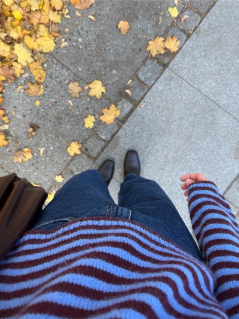 Forstykke og bakstykke samles deretter for å danne bolen, som strikkes rundt på rundpinne med striper.