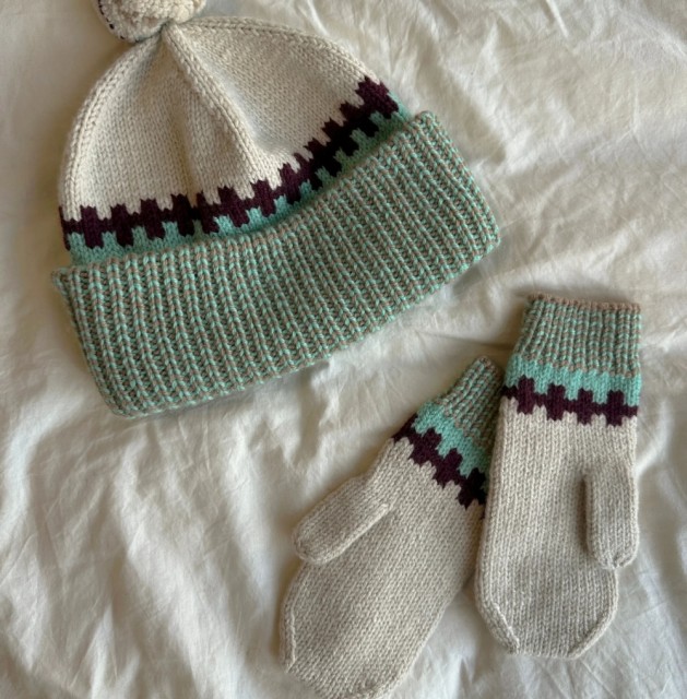 Farge 4 (stripefarge i kanter): ca. 28 (30) 32 (34) 36 g til lue og ca. 6 (8) 13 (16) 20 g til votter