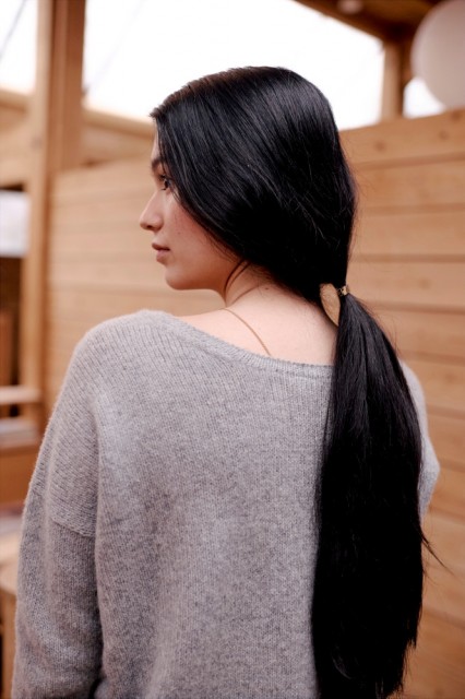 Jakken kan brukes begge veier og tilpasses ulike anledninger og personlig stil. Med den dype V-halsen foran inviterer jakken til et smykke eller et pent plagg under, mens utringning bak gir et mer overraskende og sofistikert uttrykk.