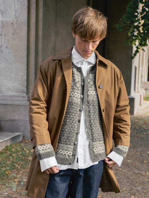 Setesdal herrekofte uten lus strikkes i Peer Gynt ovenfra og ned, med tradisjonelt mønster og klassisk herrepassform.
