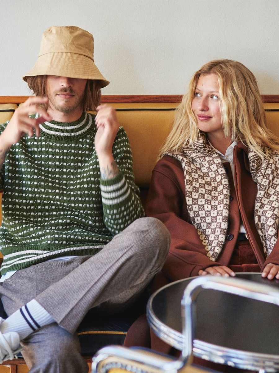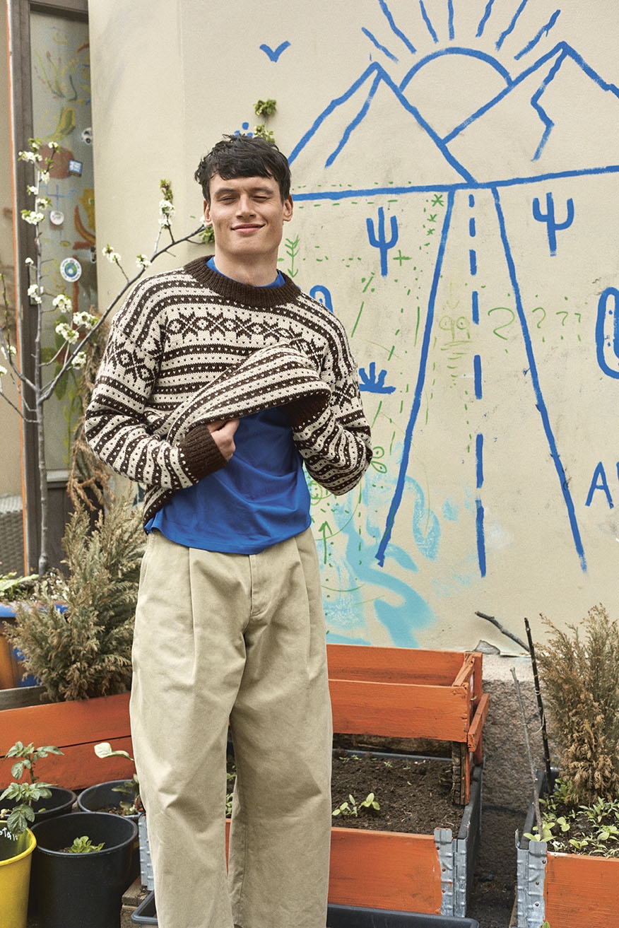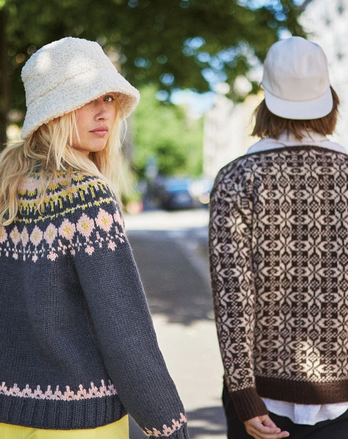 Bakkegenser - en vri på det tradisjonelle lus-mønsteret og i en morsom fargesetting, strikkes i Fivel fra Rauma. Inkl. oppskrift og garn.