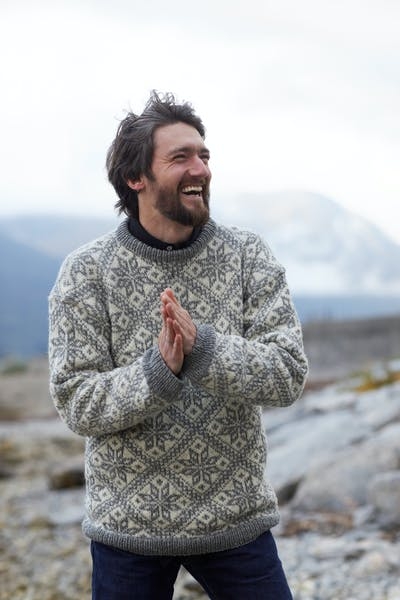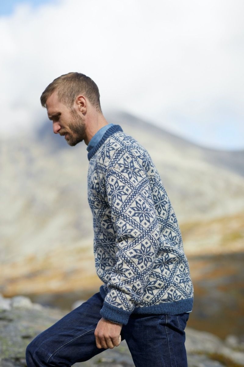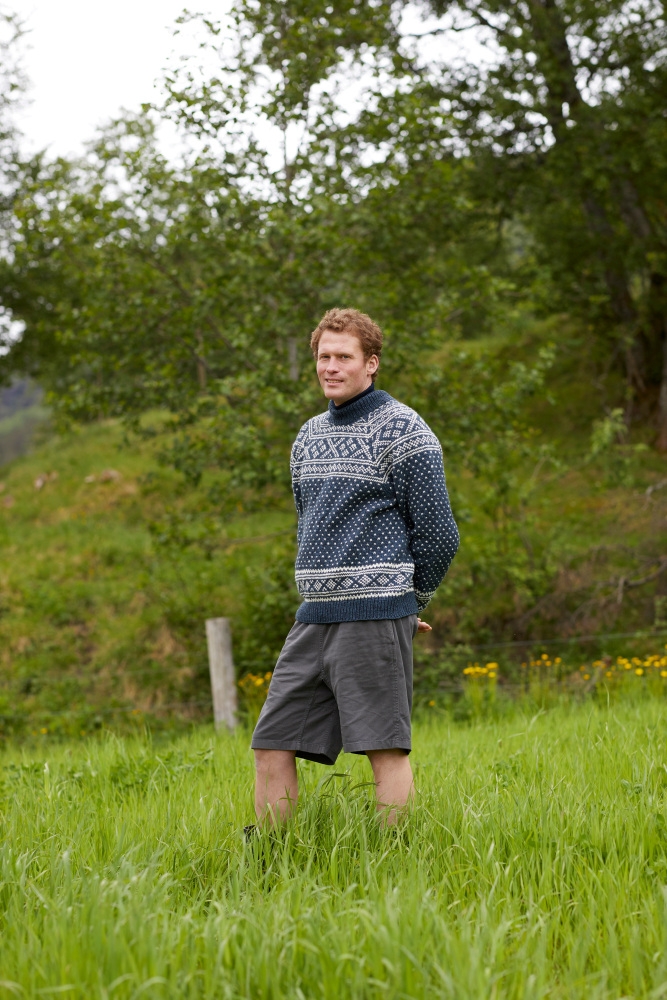Garnpakke på Bondegenser til herre. Strikket i 3 tr Strikkegarn fra Rauma Garn. Inkl. garn og mønster. fra XS-XXL