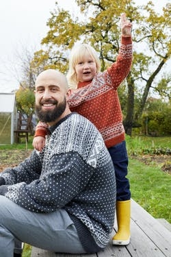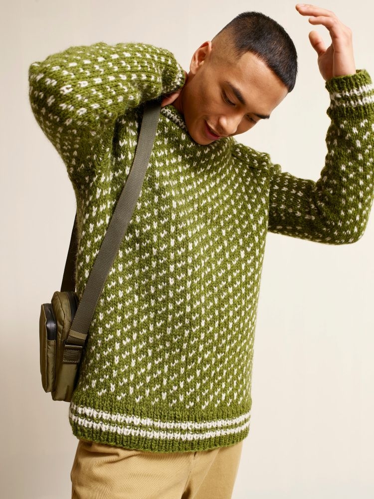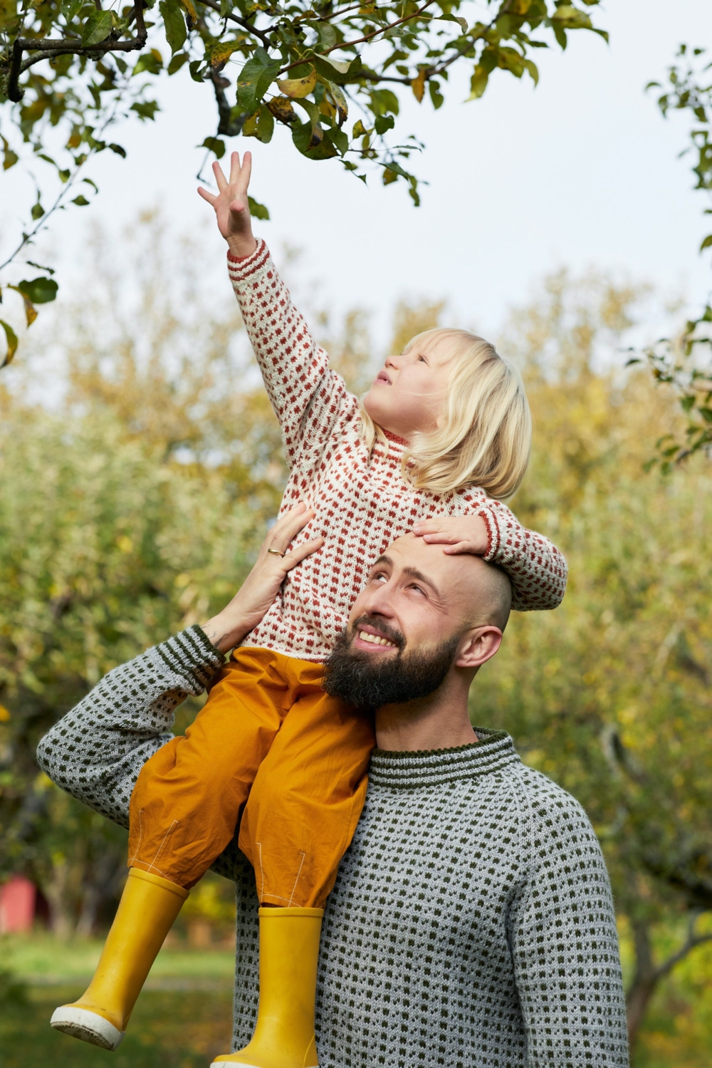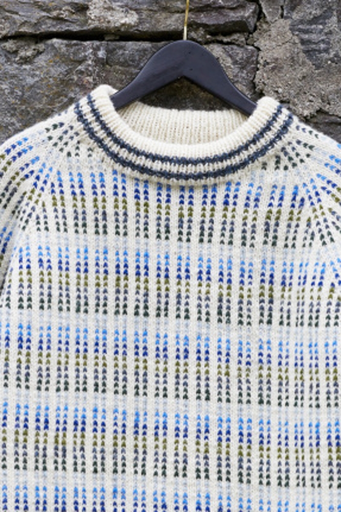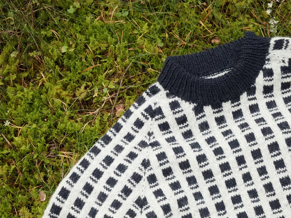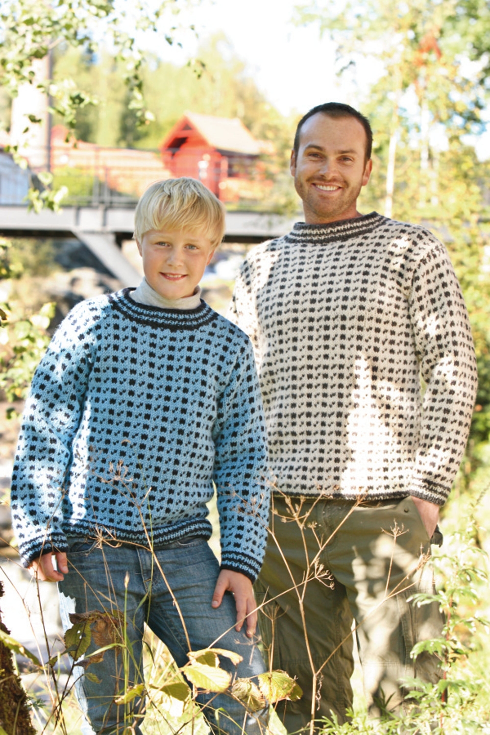 Bakkegenser - en vri på det tradisjonelle lus-mønsteret og i en morsom fargesetting, strikkes i Fivel fra Rauma. Inkl. oppskrift og garn.