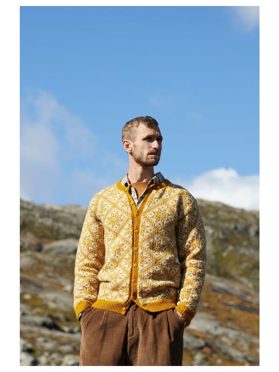 405-2 Fjelljakke i Finull herre Lys beige og Mørk sennepsgul Strikkepakke